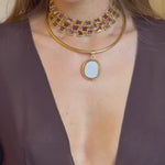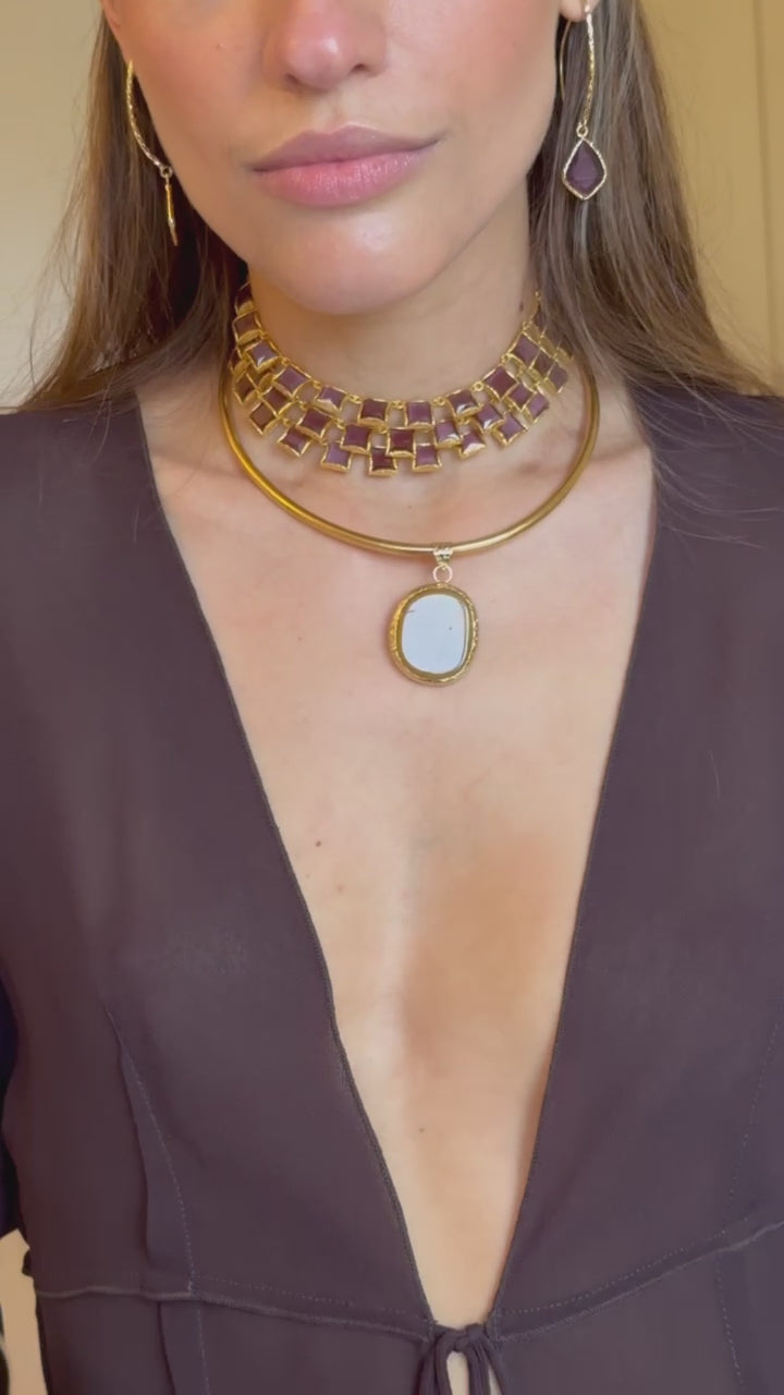 Este chocker tiene lo mejor de los 3 mundos. Está hecho a mano en latón bañado en oro de 18k y piedras naturales de cuarzo granate que simbolizan el poder y la elegancia.