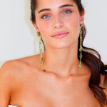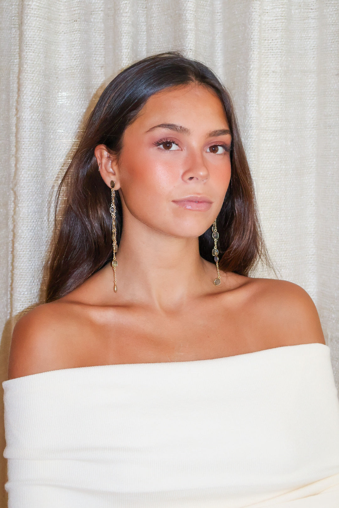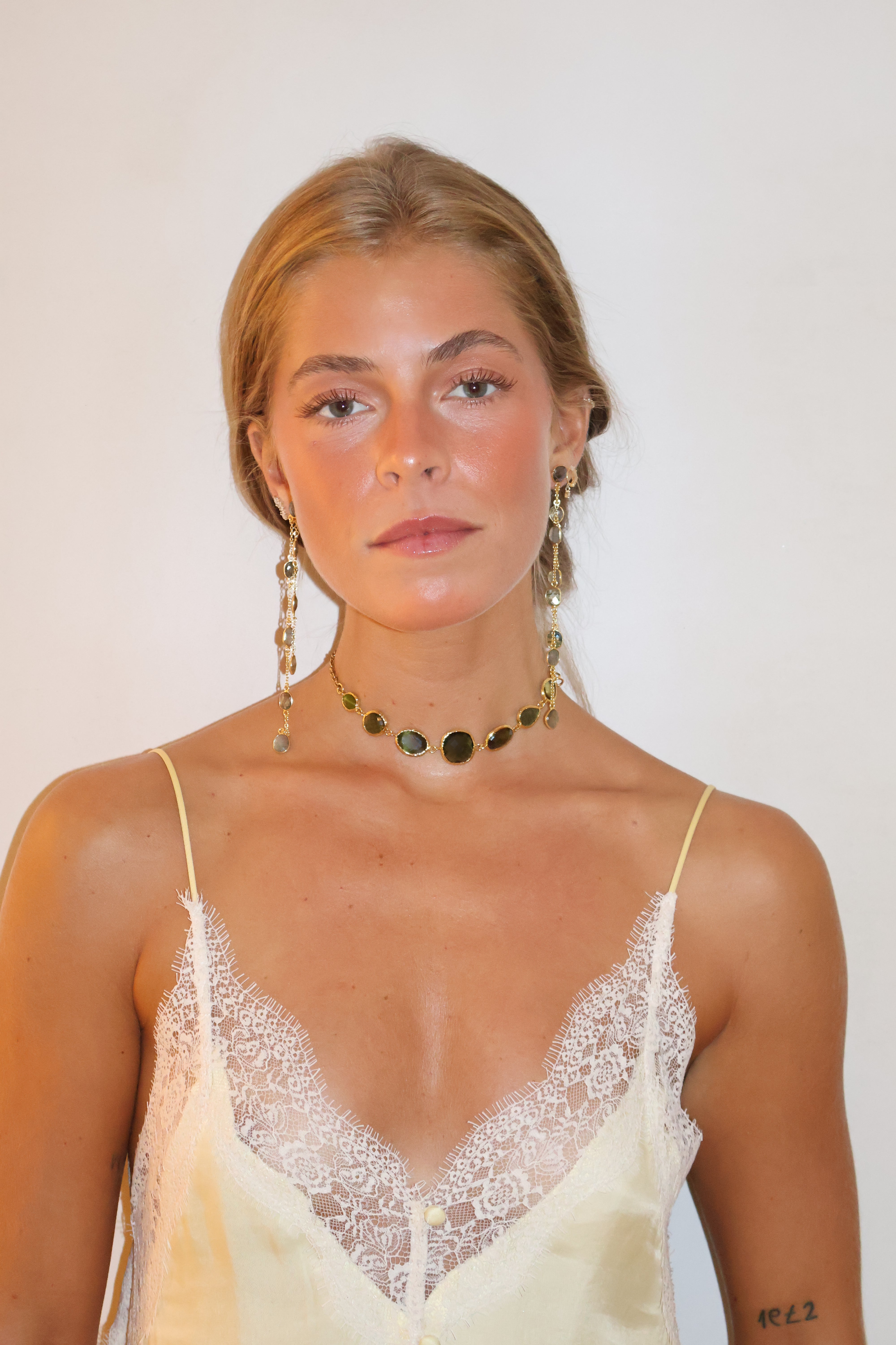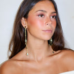 Este pendiente está hecho a mano en latón bañado en oro de 18k y piedras naturales de aventurina. Una pieza que evoca la quietud y el brillo de la luna.