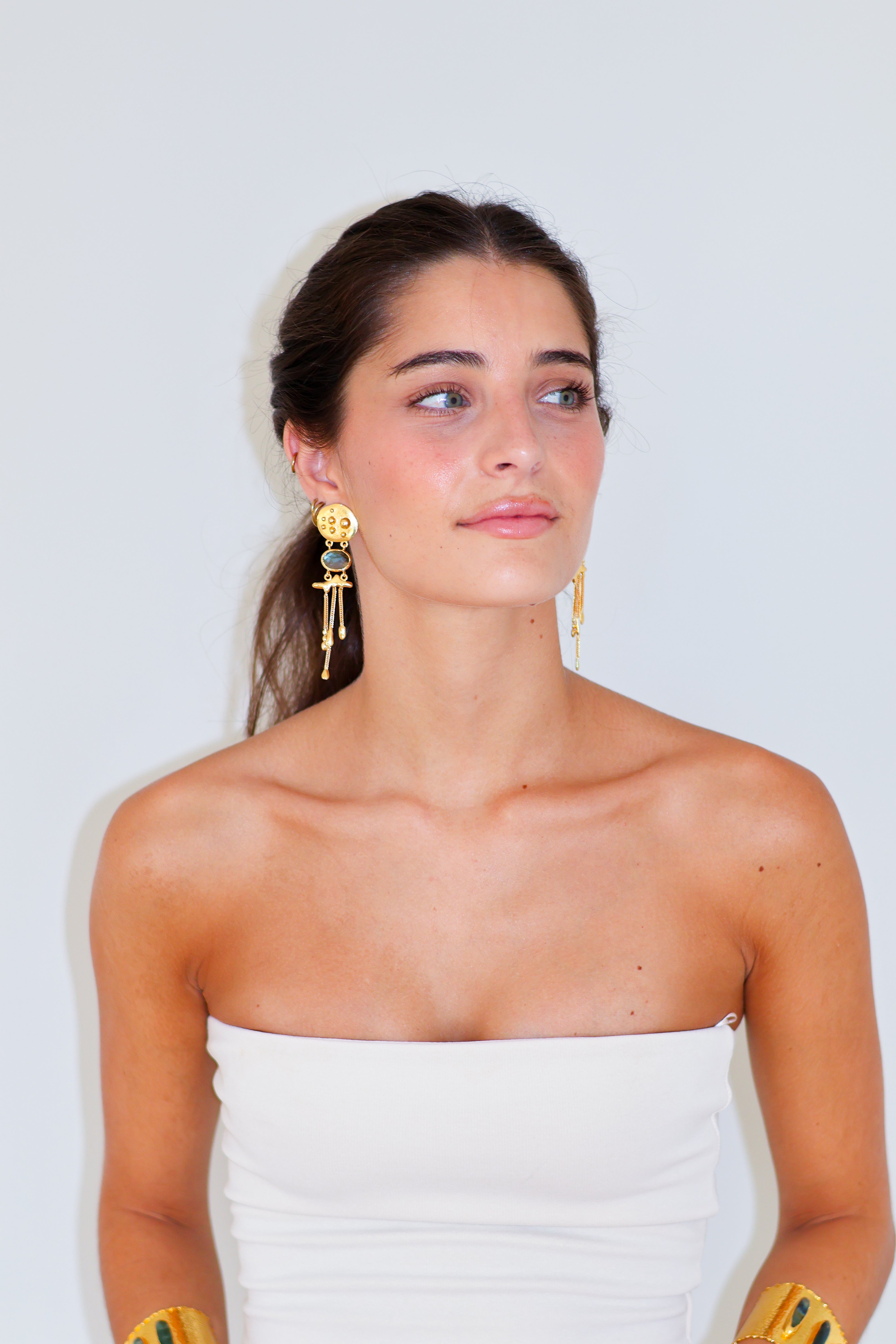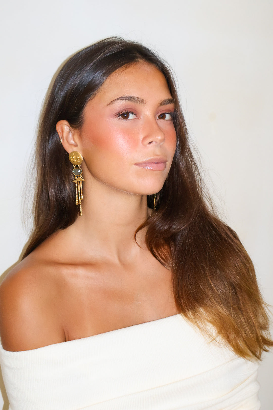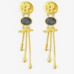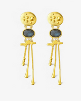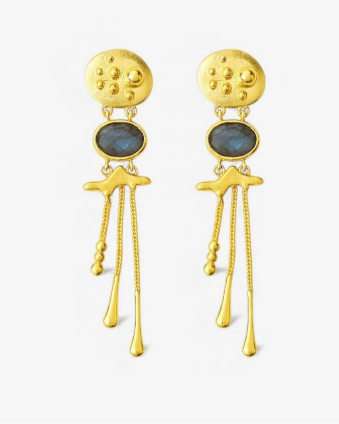 Este pendiente está hecho a mano en latón bañado en oro de 18k y piedras naturales de labradorita. Una pieza que evoca la magia de las nebulosas, la danza de la luz y la energía del universo.