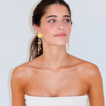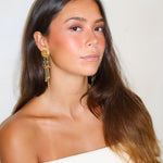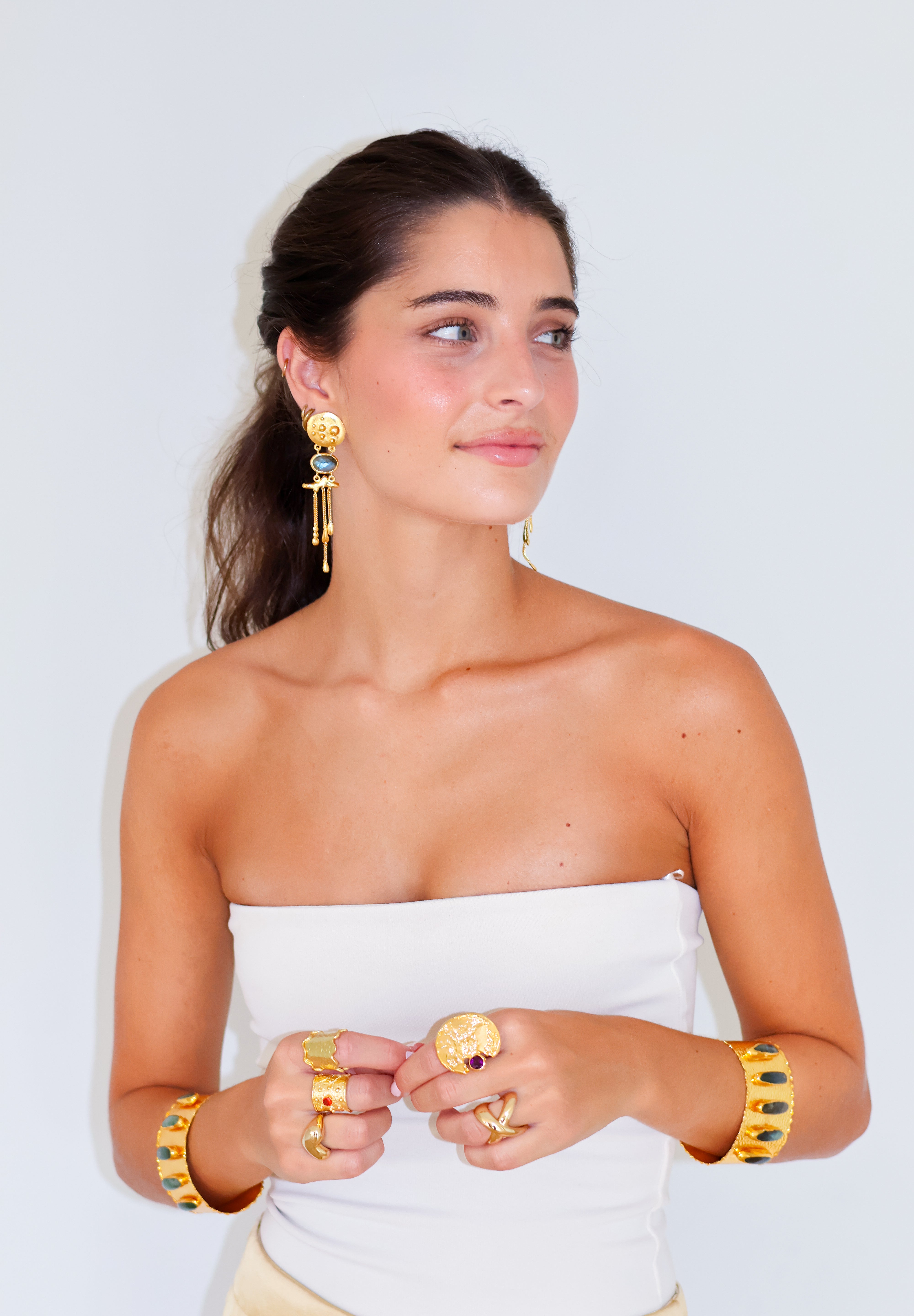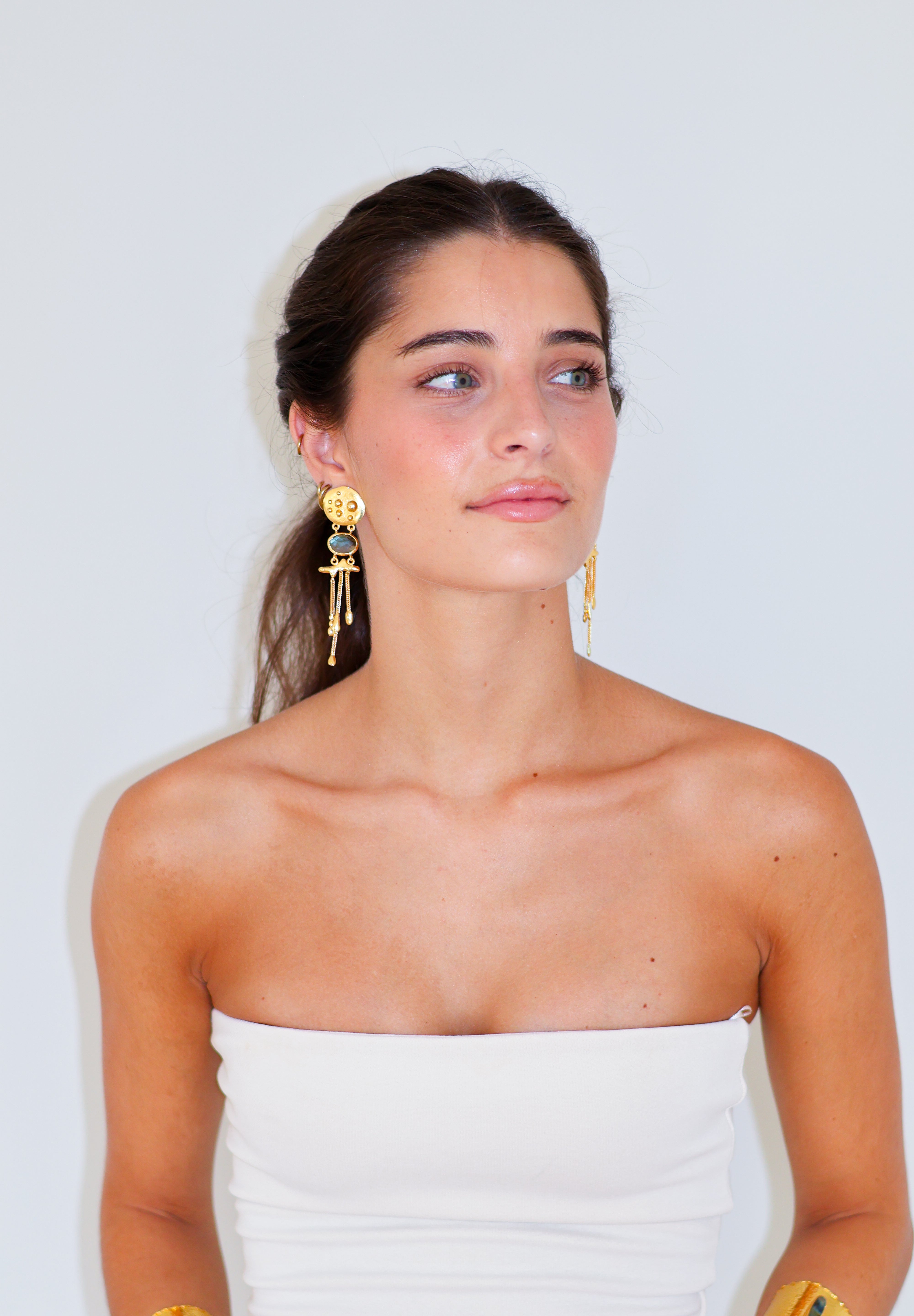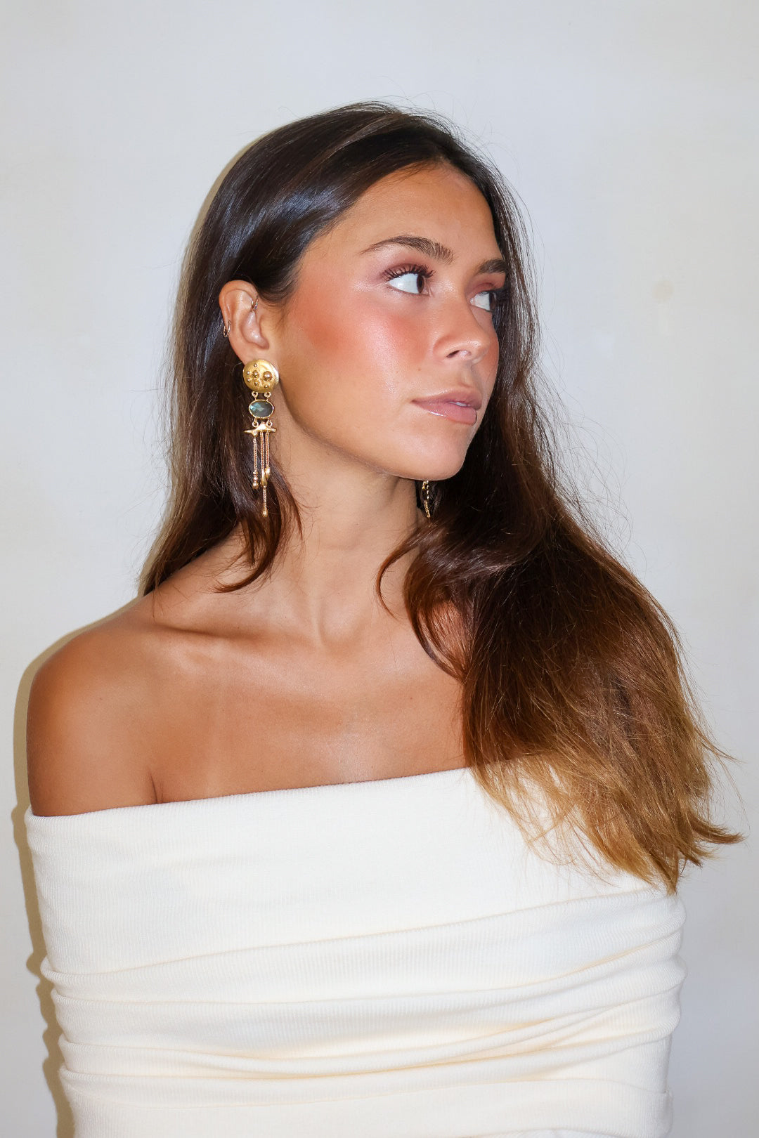 Este pendiente está hecho a mano en latón bañado en oro de 18k y piedras naturales de labradorita. Una pieza que evoca la magia de las nebulosas, la danza de la luz y la energía del universo.