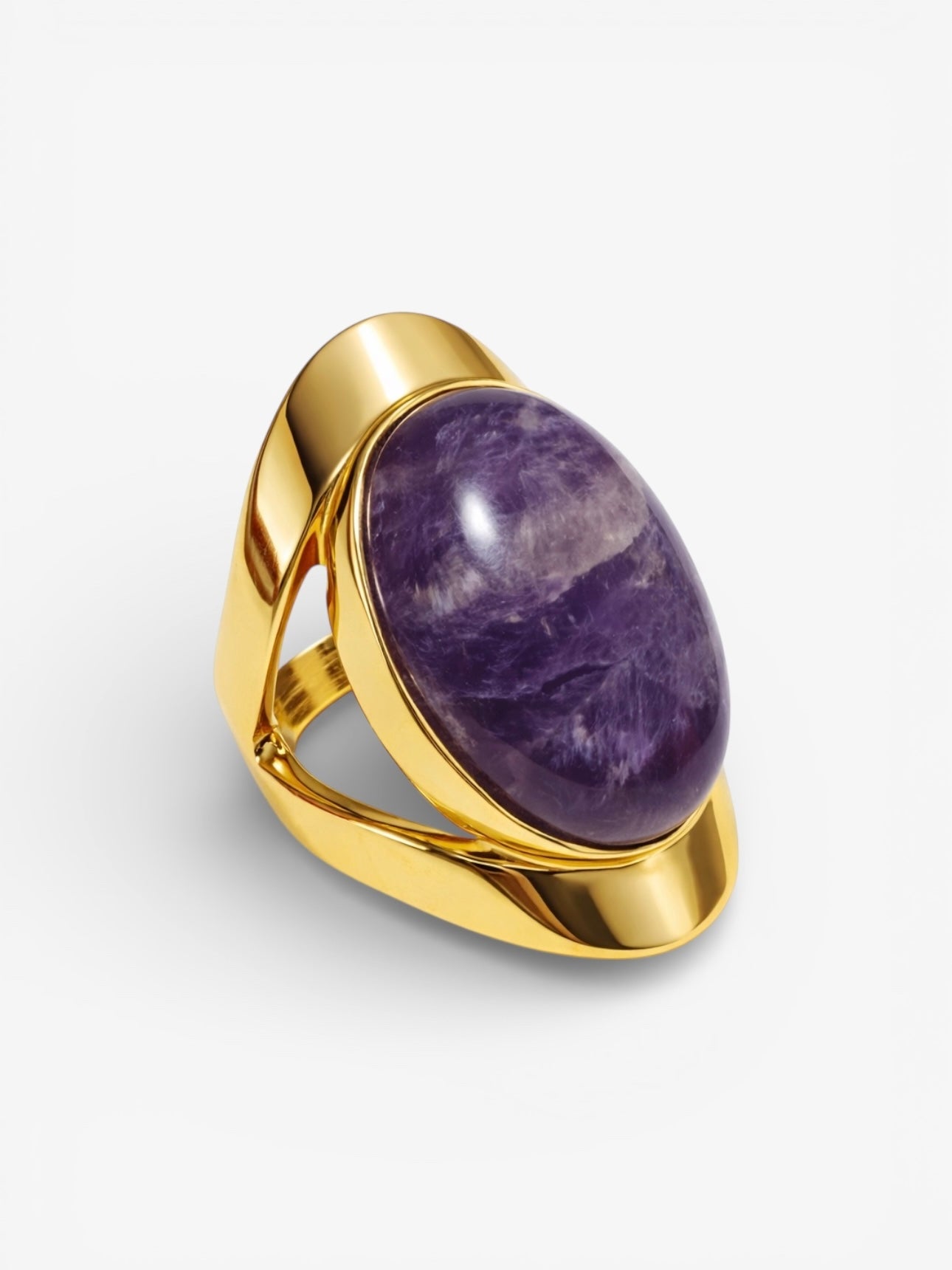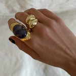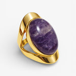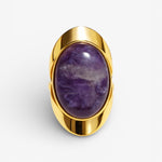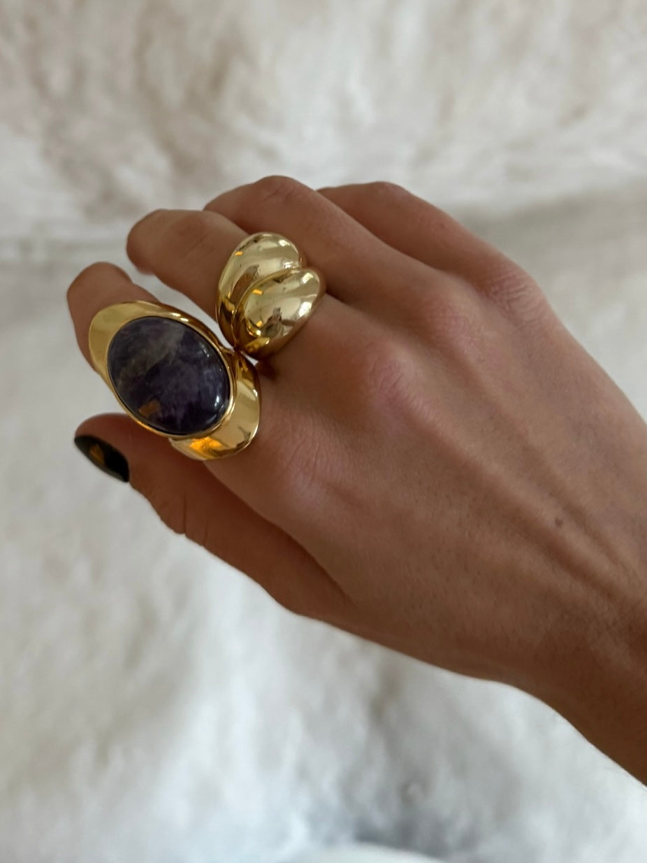 El Anillo Amatista es una pieza de líneas suaves y volumen elegante, inspirada en la fuerza serena y el misterio de esta piedra natural. Su amatista, con matices violetas profundos y únicos, crea un contraste luminoso con el dorado que convierte este anillo en una joya atemporal y especial.