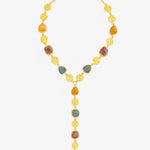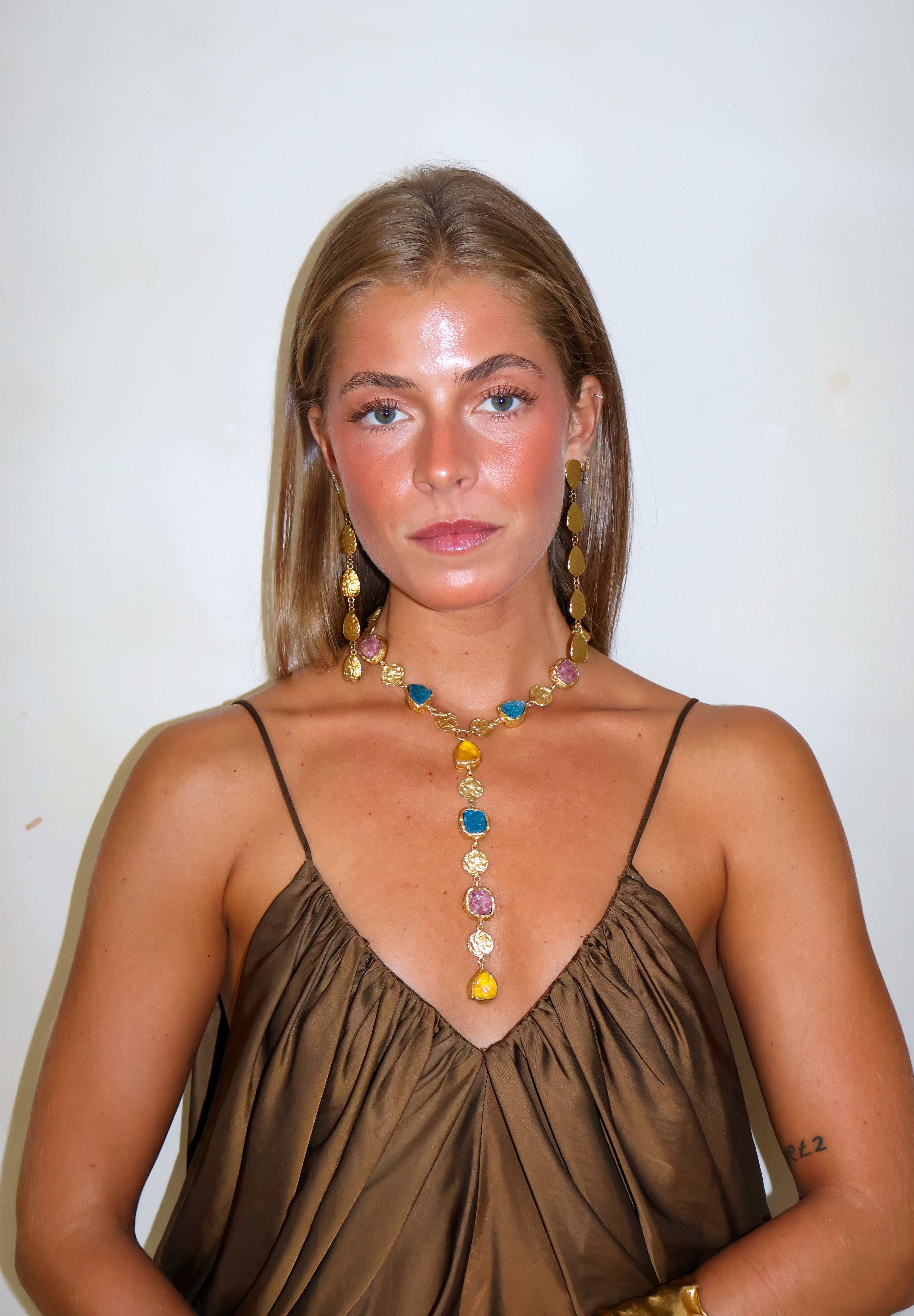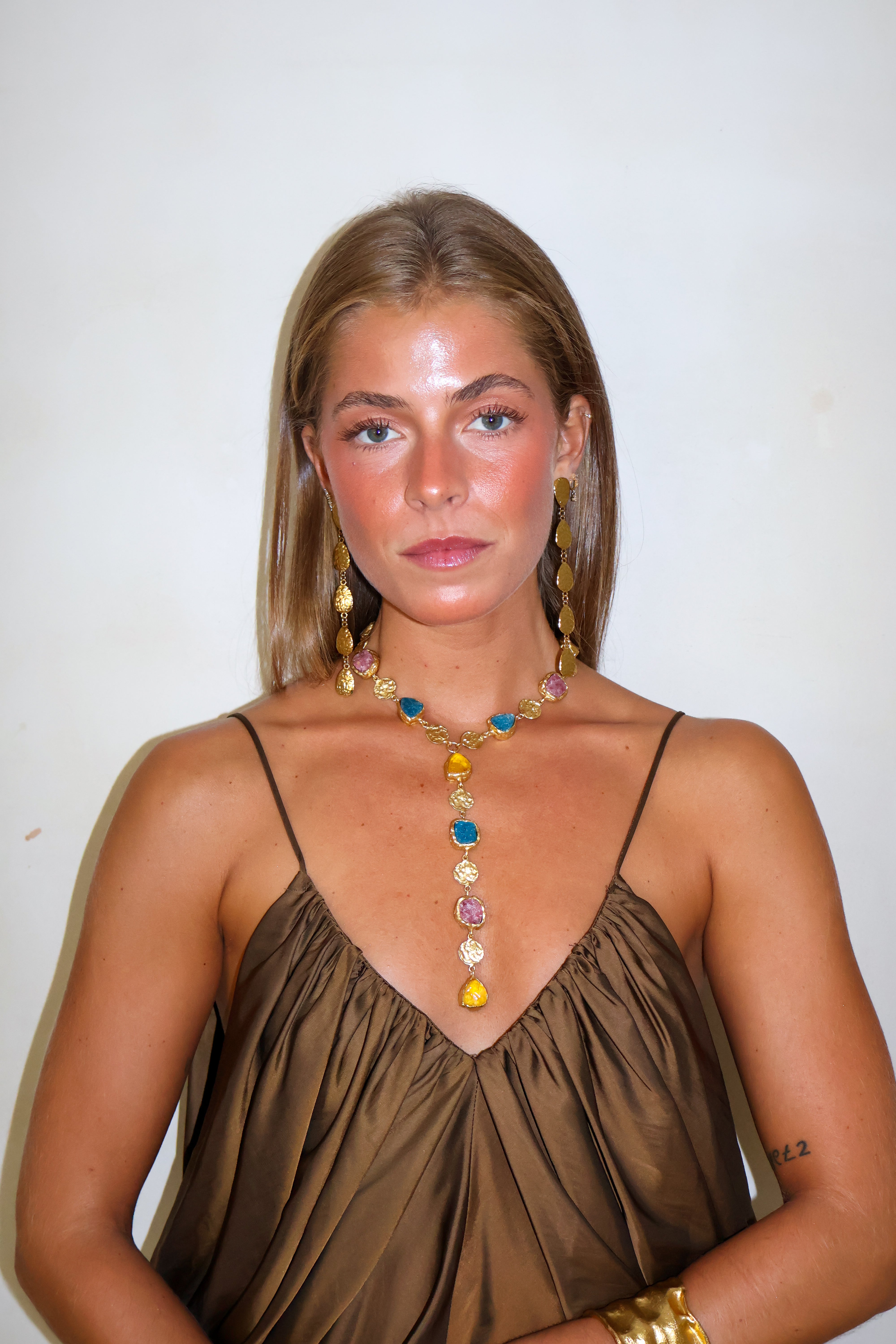 La combinación de turmalina rosa, apatita azul y cuarzo limón convierte este collar en un"must have", diseñado para mujeres que se atreven con todo.