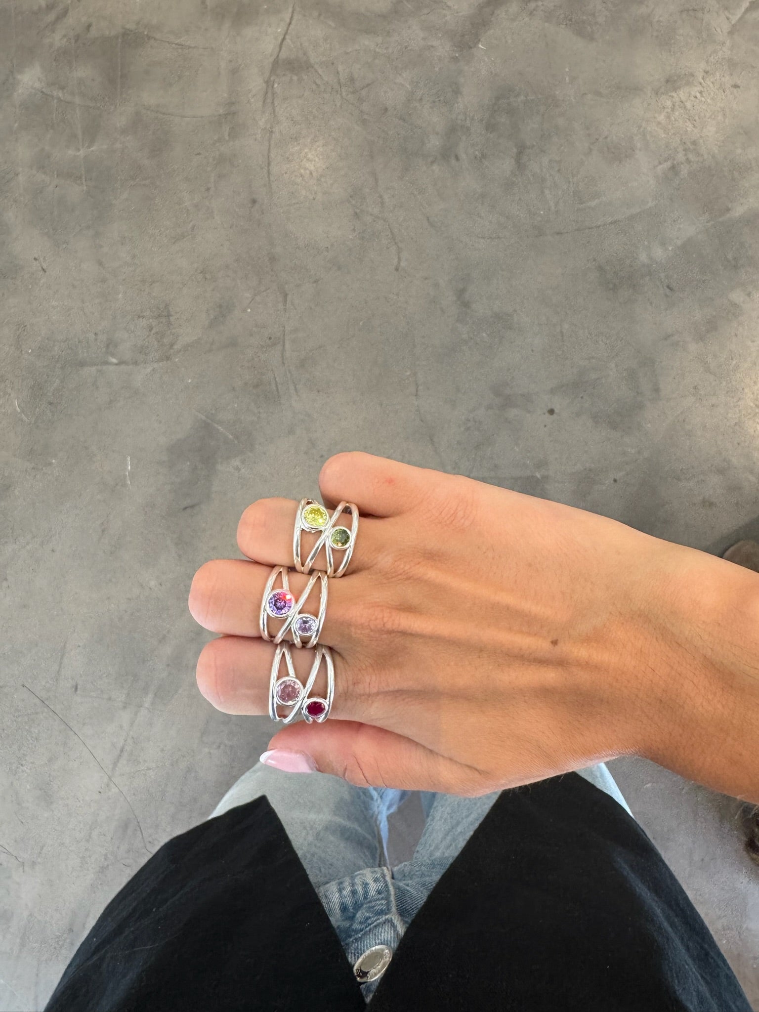 Anillo ajustable de doble aro cruzado, con dos circonitas que aportan brillo y color. Hecho en latón bañado en plata 925.