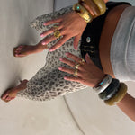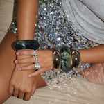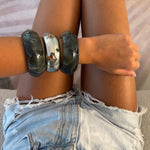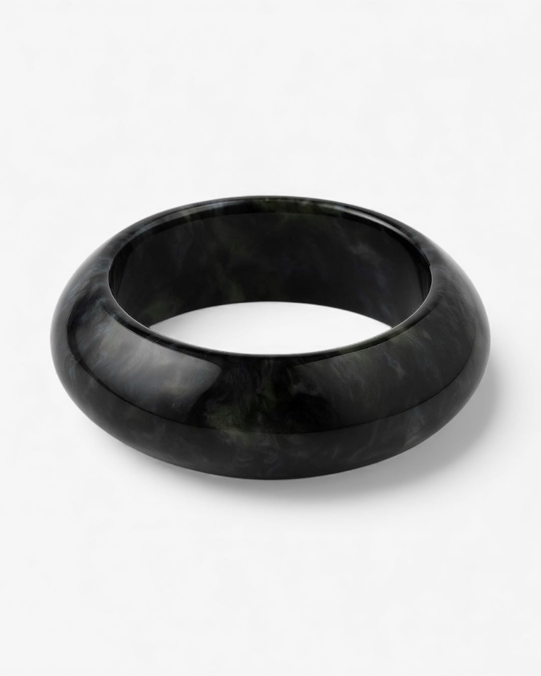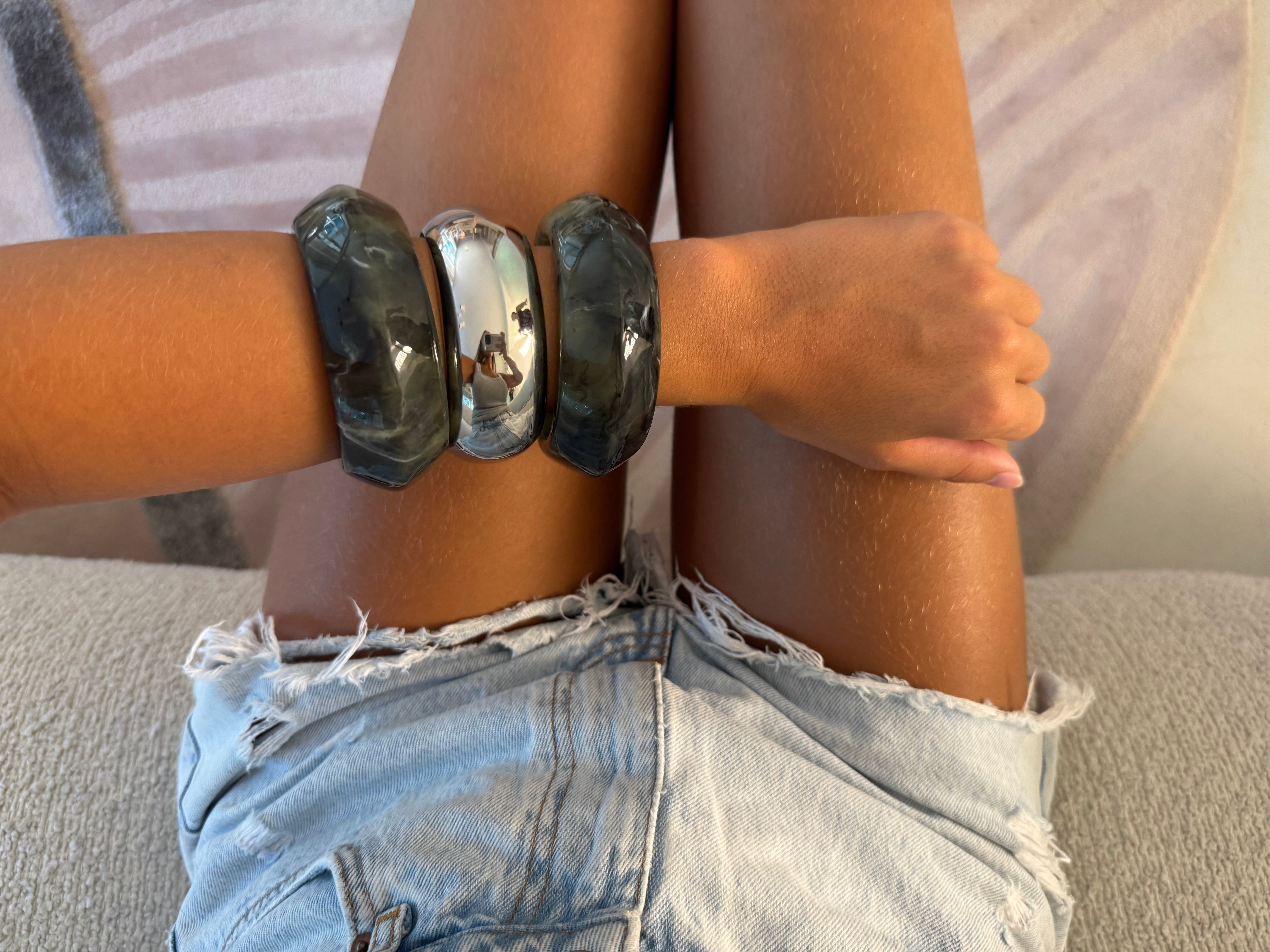 Acabado en negro con vetas marmoleadas en tonos grisáceos y verdosos crea un efecto único, diferente en cada pieza. Perfecto para llevar solo como protagonista o combinado con otros accesorios para un look más potente.