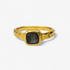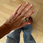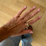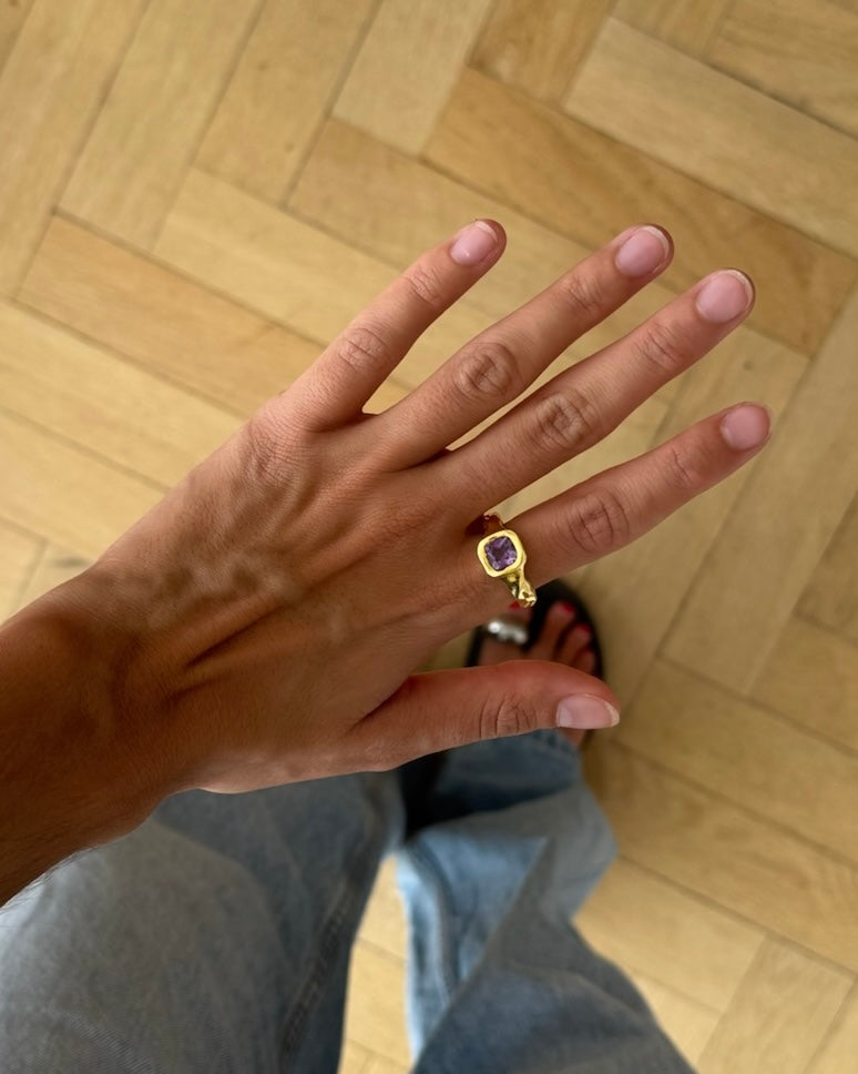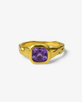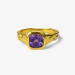 Anillo Cosmos hecho a mano en bronce con baño en oro de 18k y piedra natural amatista.