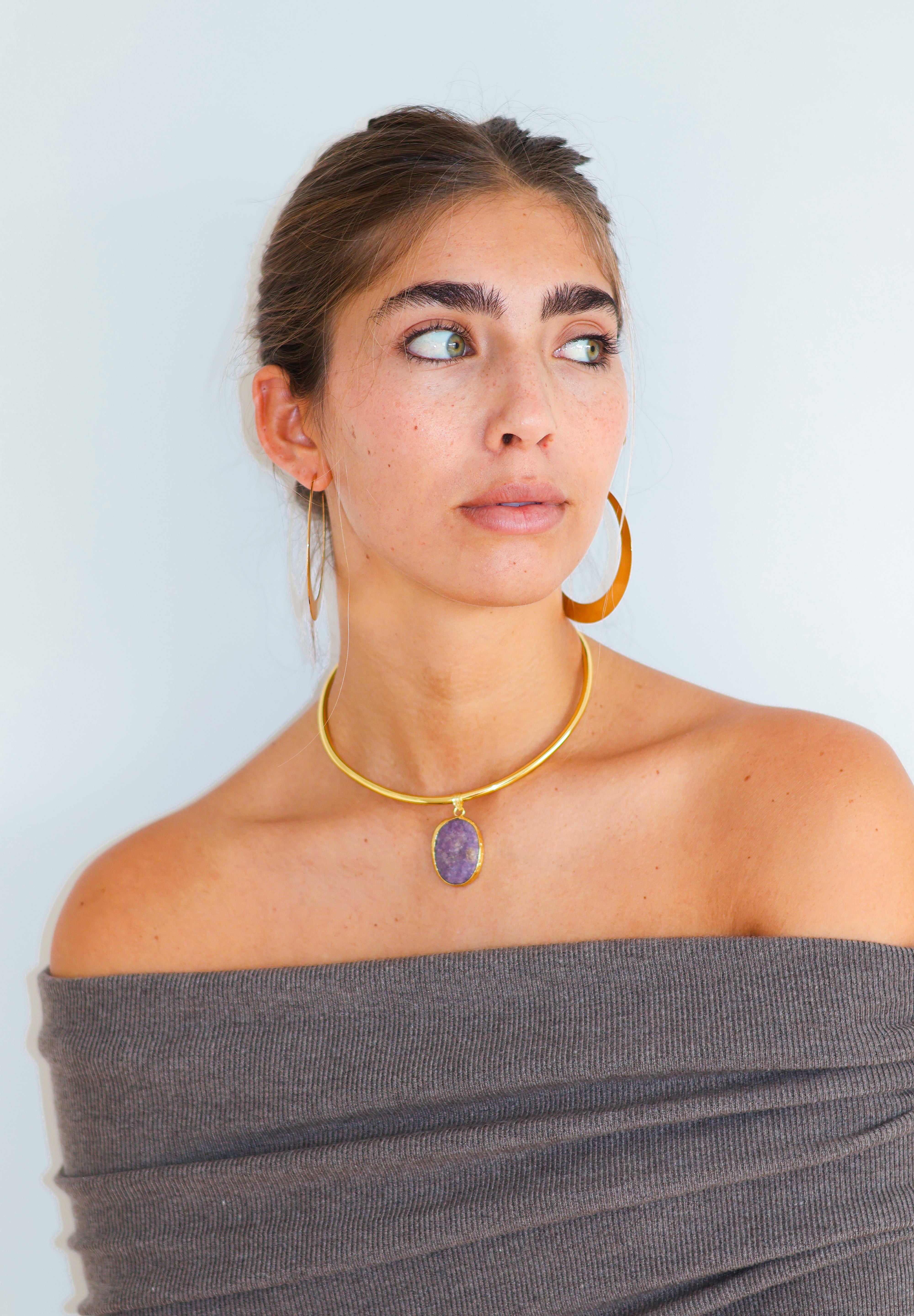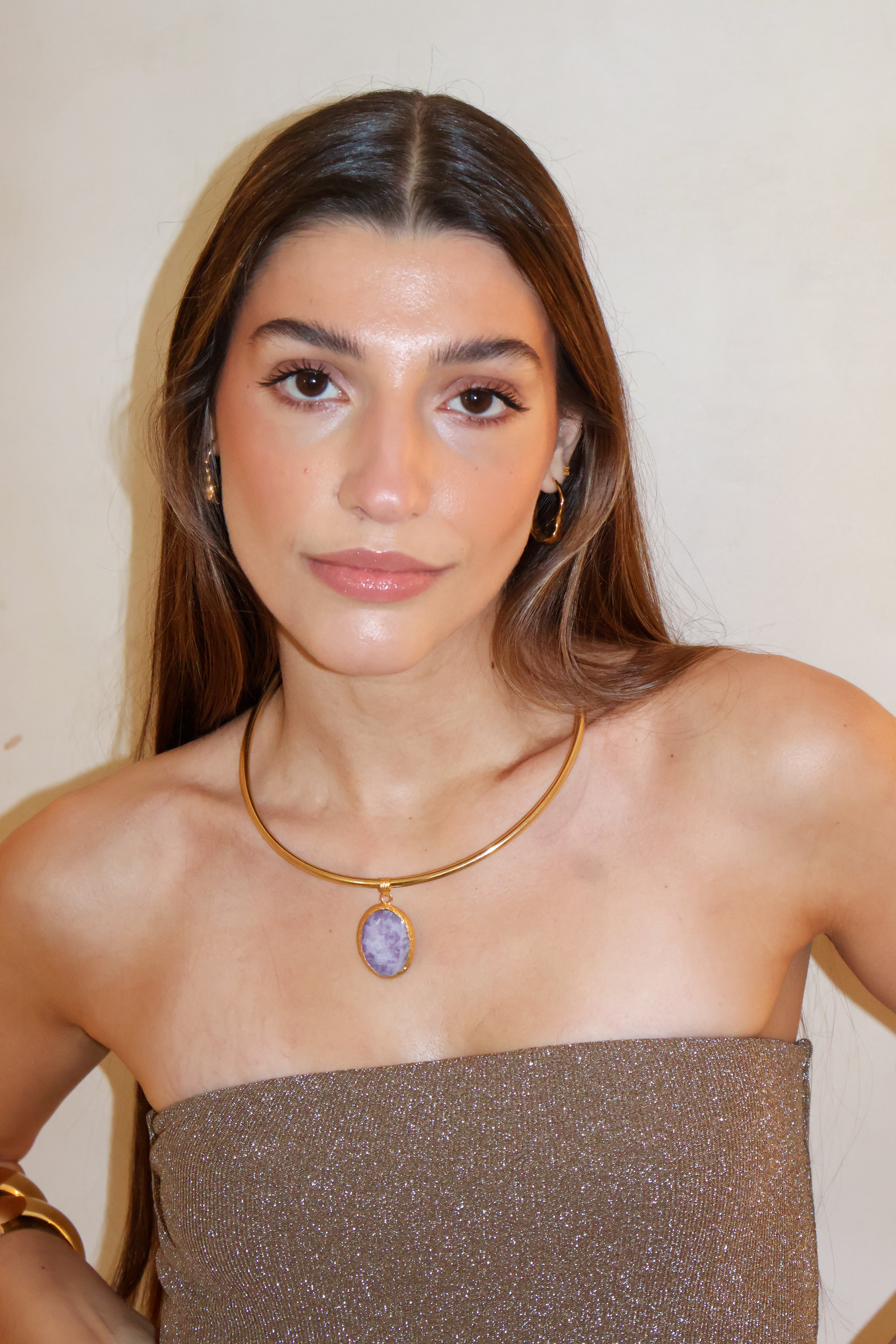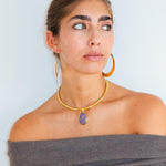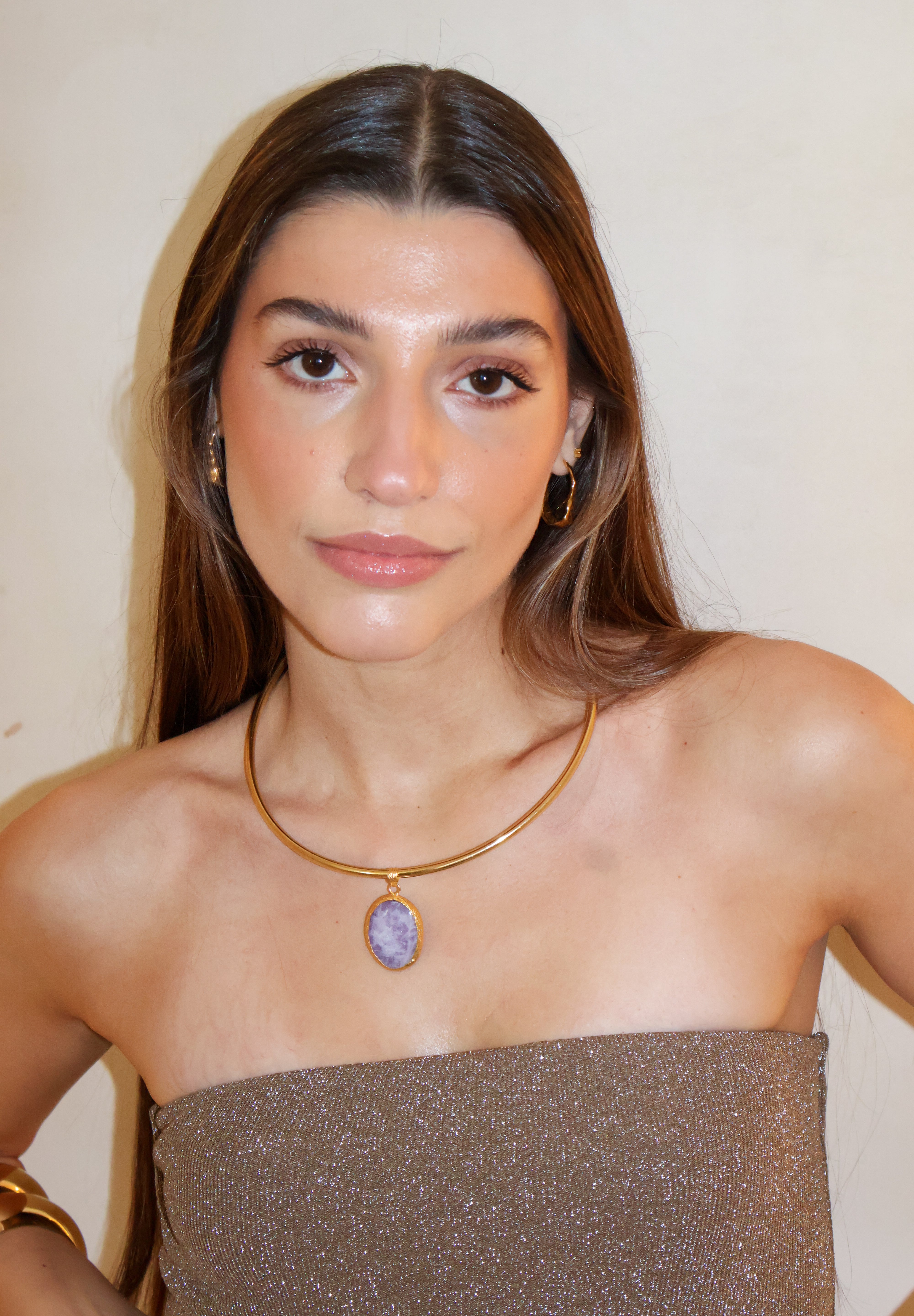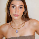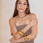 Este chocker está hecho a mano en latón bañado en oro de 18k y piedras naturales que irradian fuerza, magnetismo y autenticidad. Un amuleto que actúa como un recordatorio de tu luz, un secreto que descansa sobre la piel.