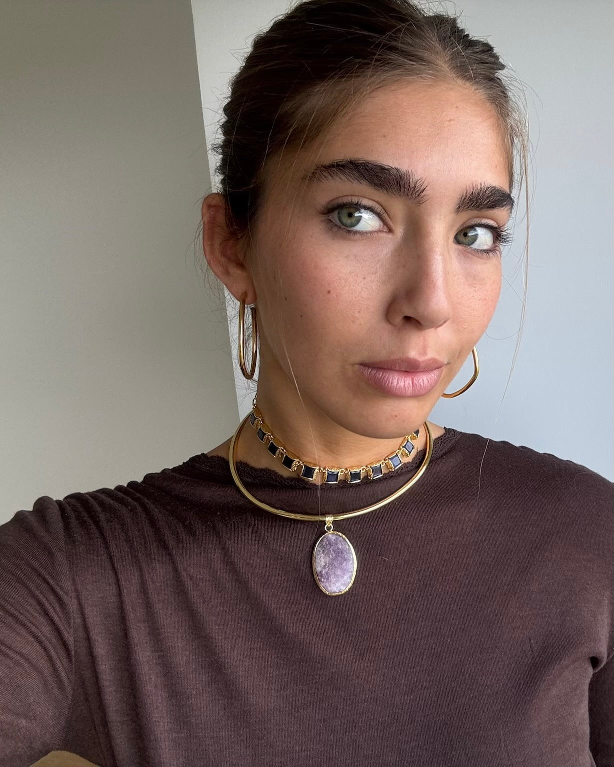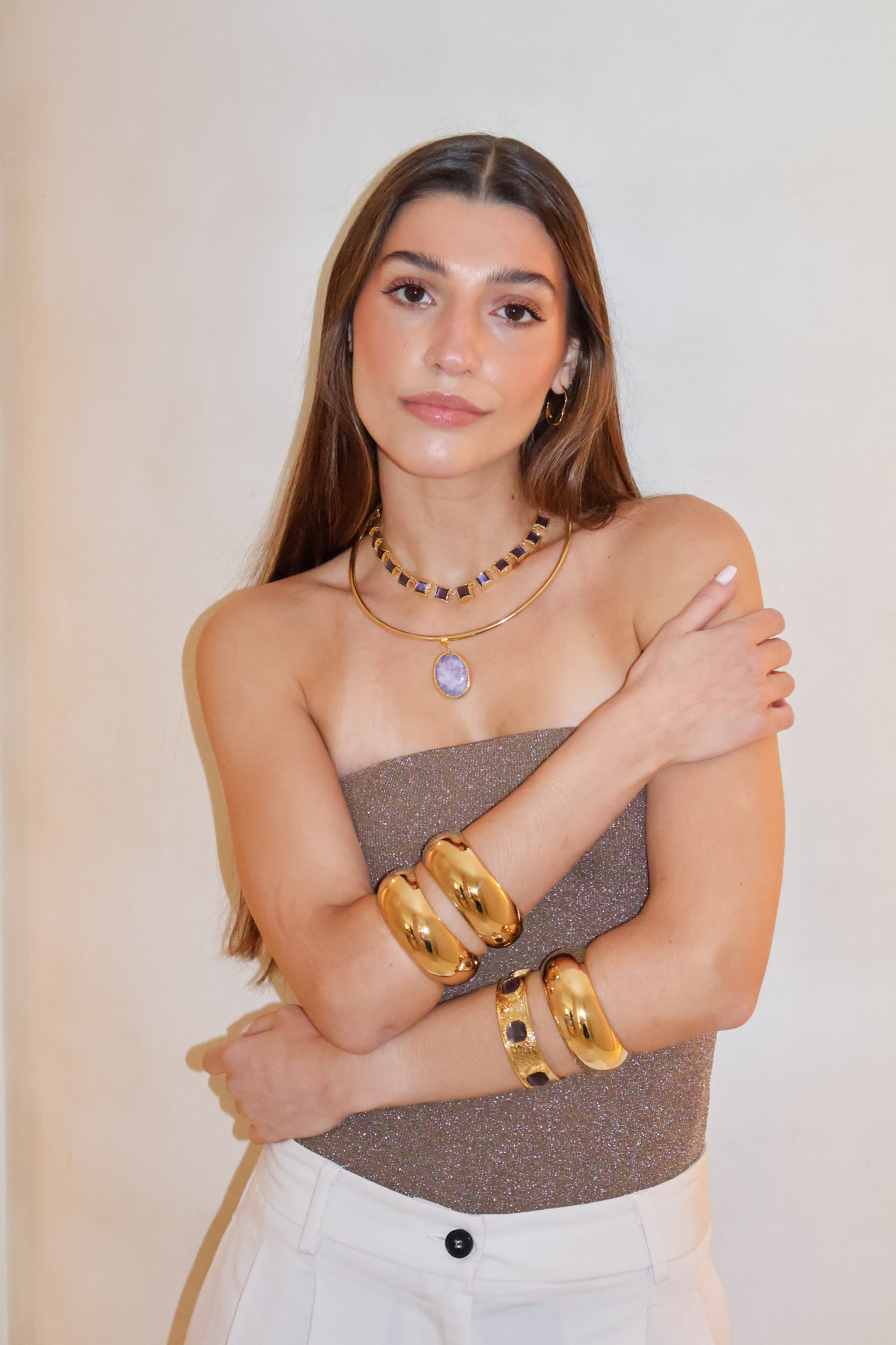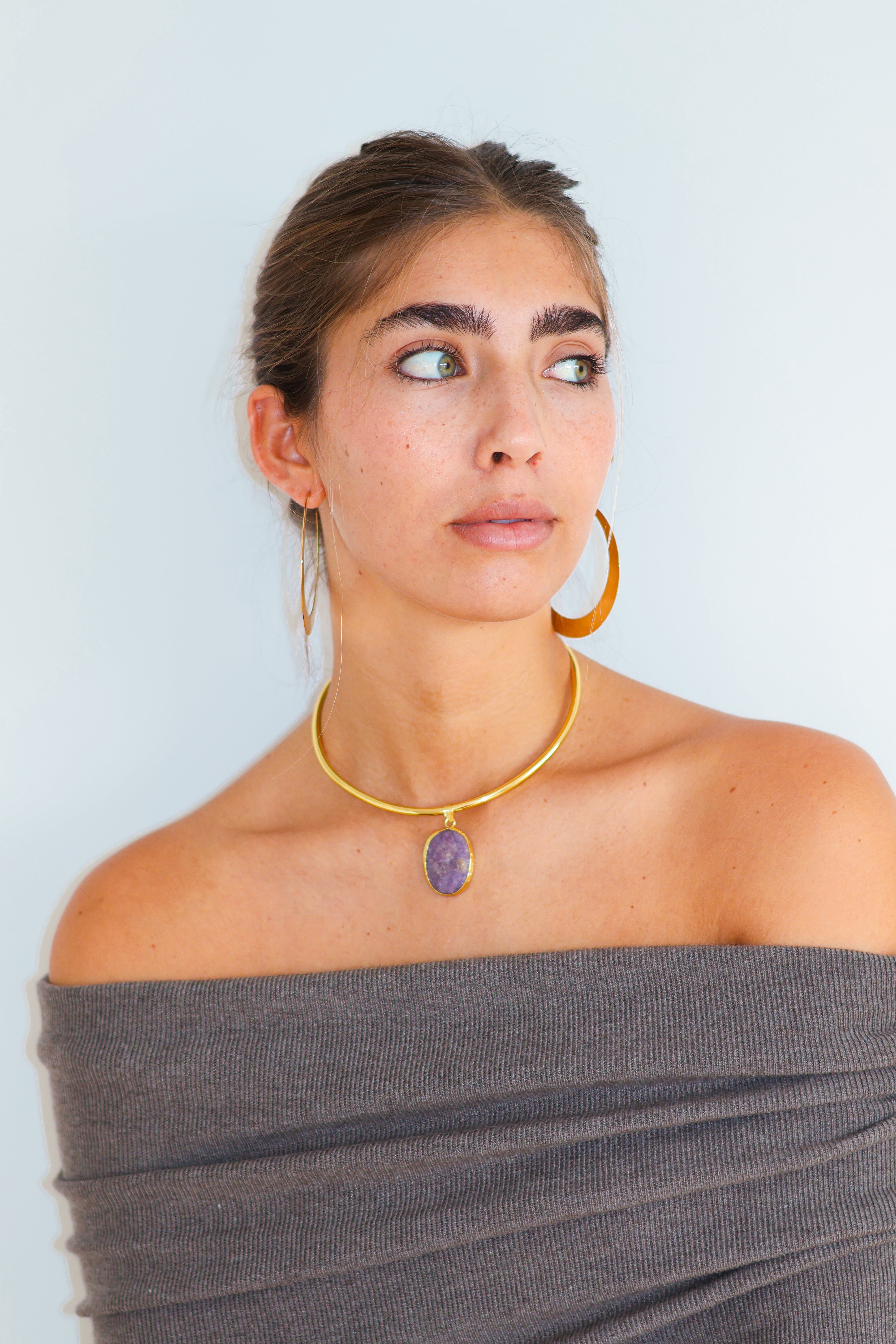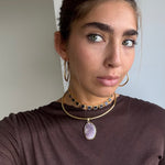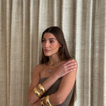 Este chocker está hecho a mano en latón bañado en oro de 18k y piedras naturales que irradian fuerza, magnetismo y autenticidad. Un amuleto que actúa como un recordatorio de tu luz, un secreto que descansa sobre la piel.