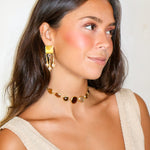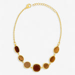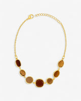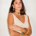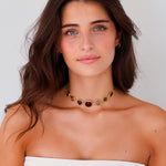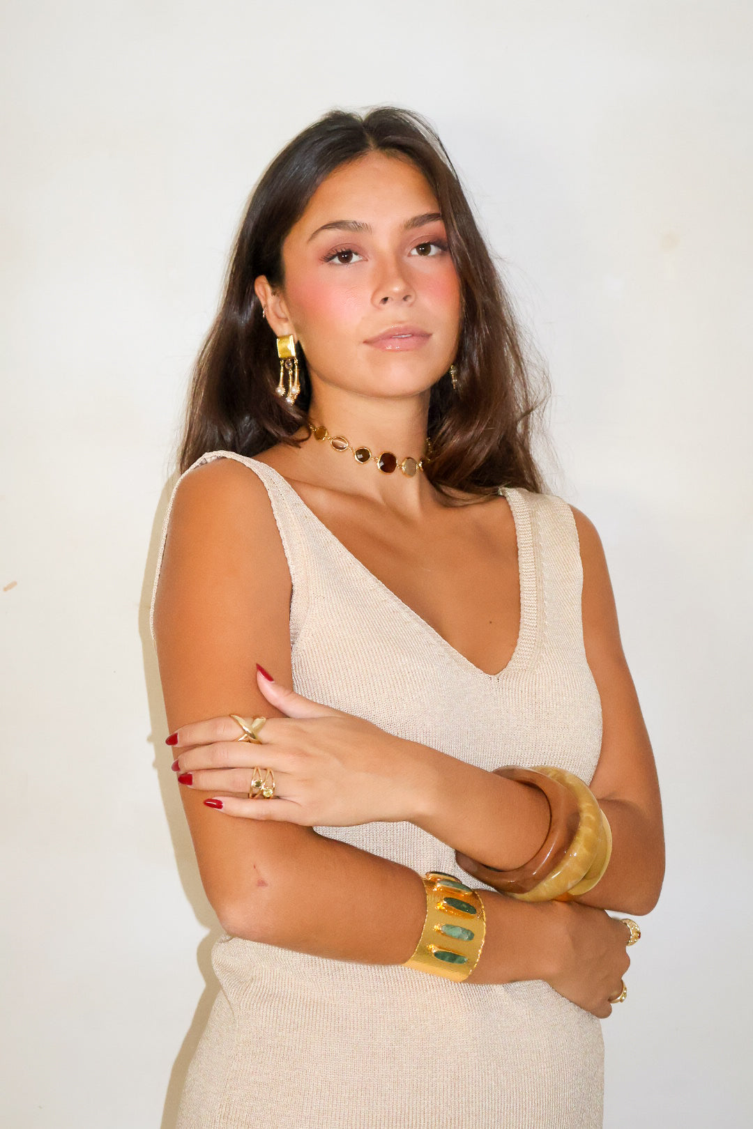 Este chocker está hecho a mano en latón bañado en oro de 18k y piedras naturales en tonos marrones. Disponible en tres colores, el Chocker Senda evoca una profunda raíz con la naturaleza, promoviendo un sentido de pertenencia y equilibrio interior
