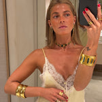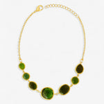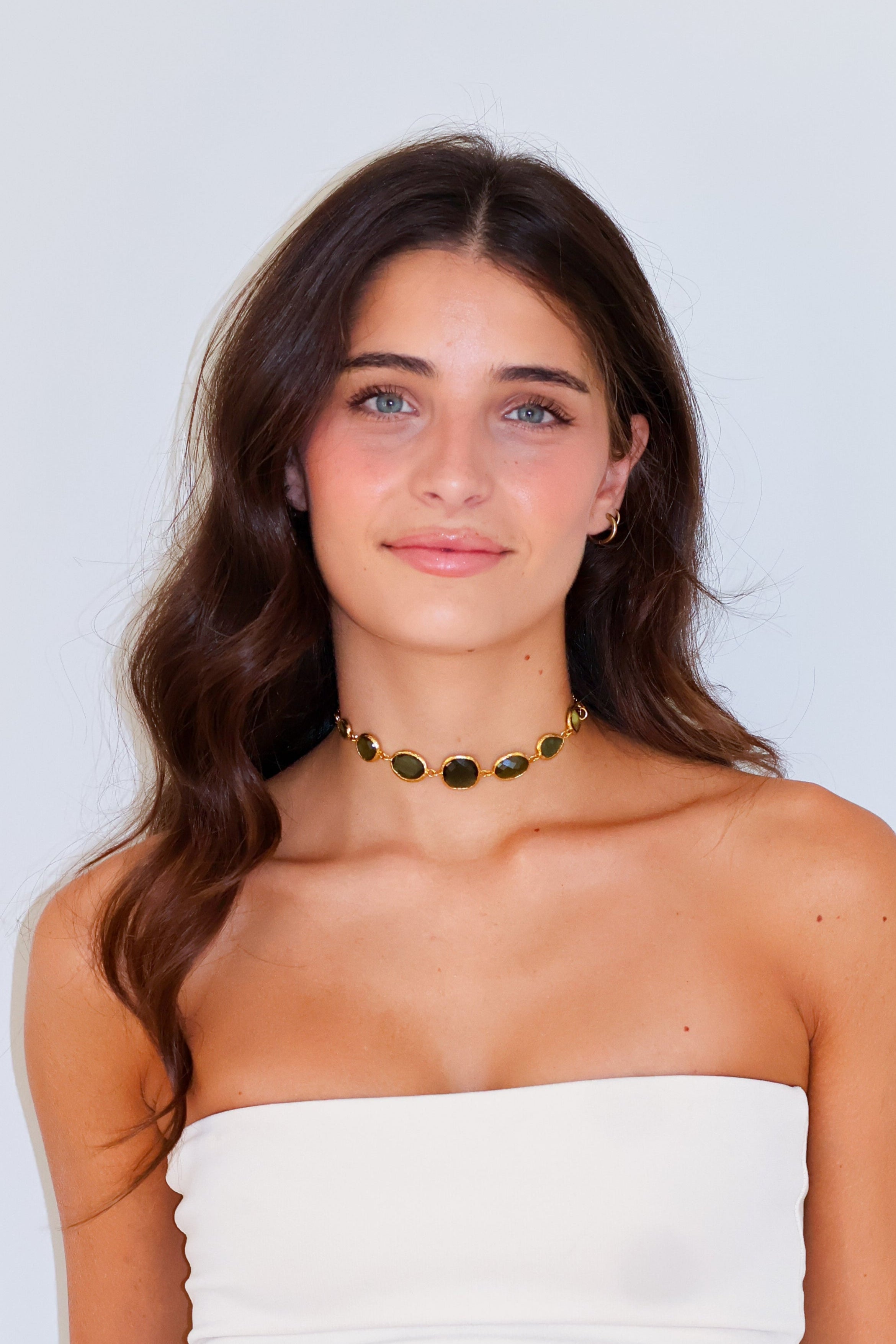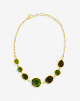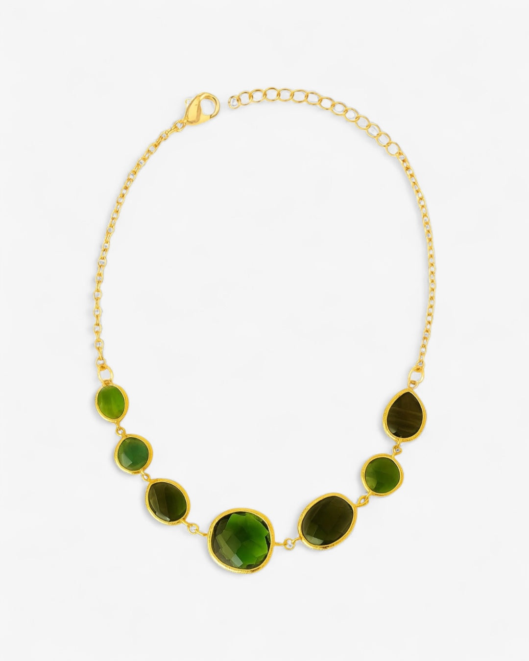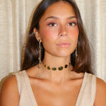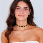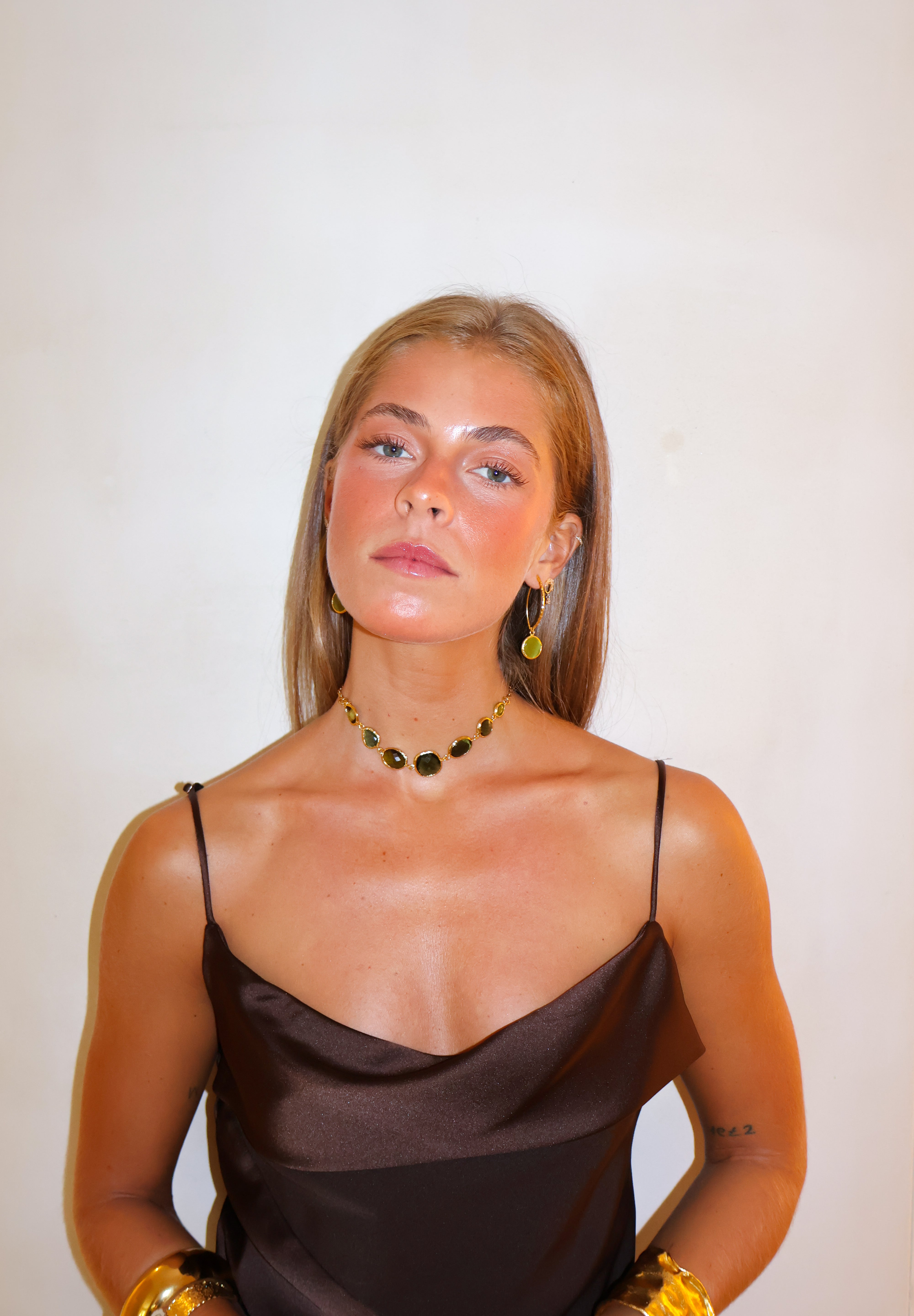 Este chocker está hecho a mano en latón bañado en oro de 18k y piedras naturales en tonos verdes. Disponible en tres colores, el Chocker Senda evoca una profunda raíz con la naturaleza, promoviendo un sentido de pertenencia y equilibrio interior