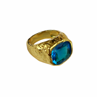 Anillo estructural hecho a mano en latón bañado en oro de 18k con acabado martelé y piedra talla esmeralda en azul intenso.