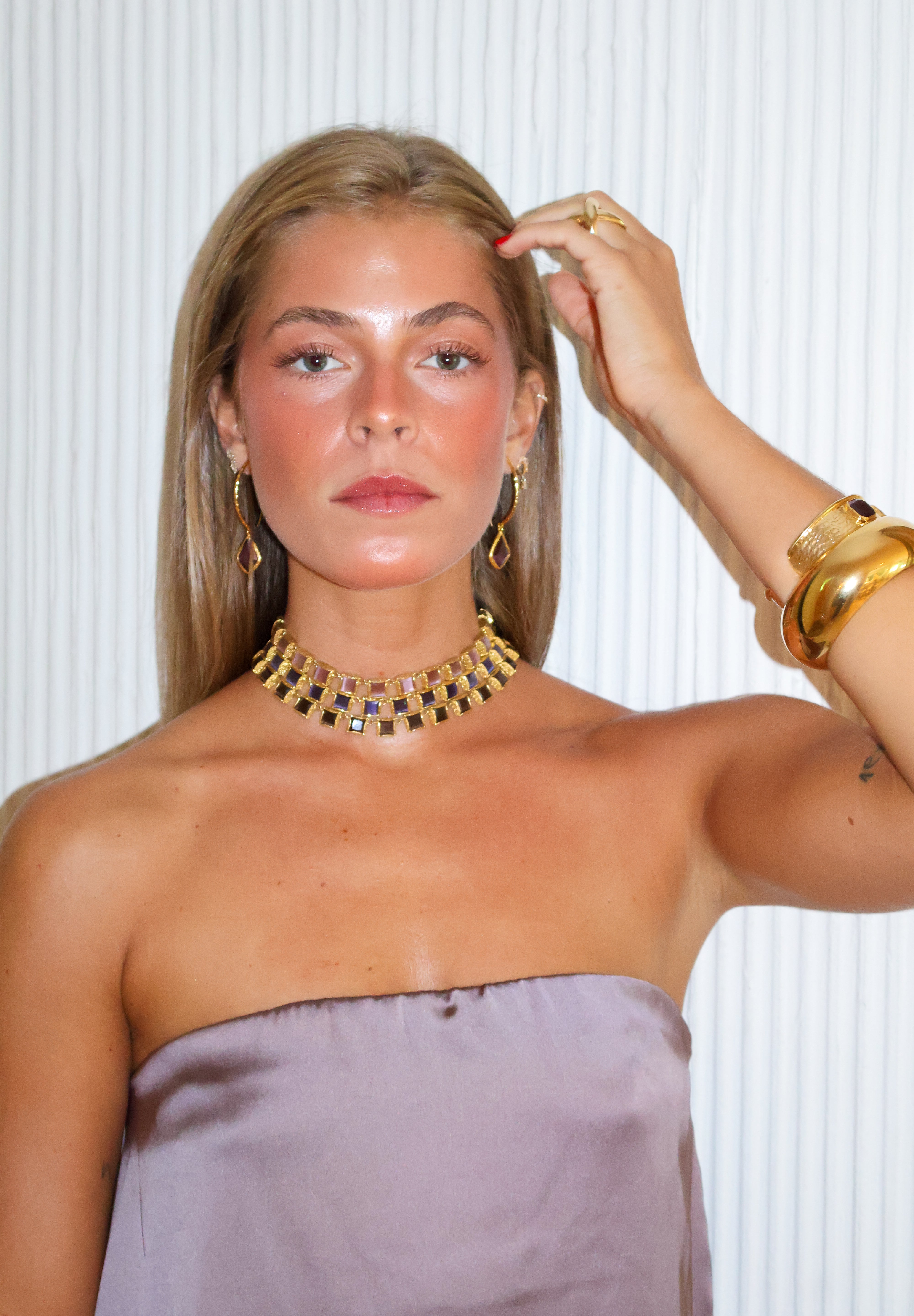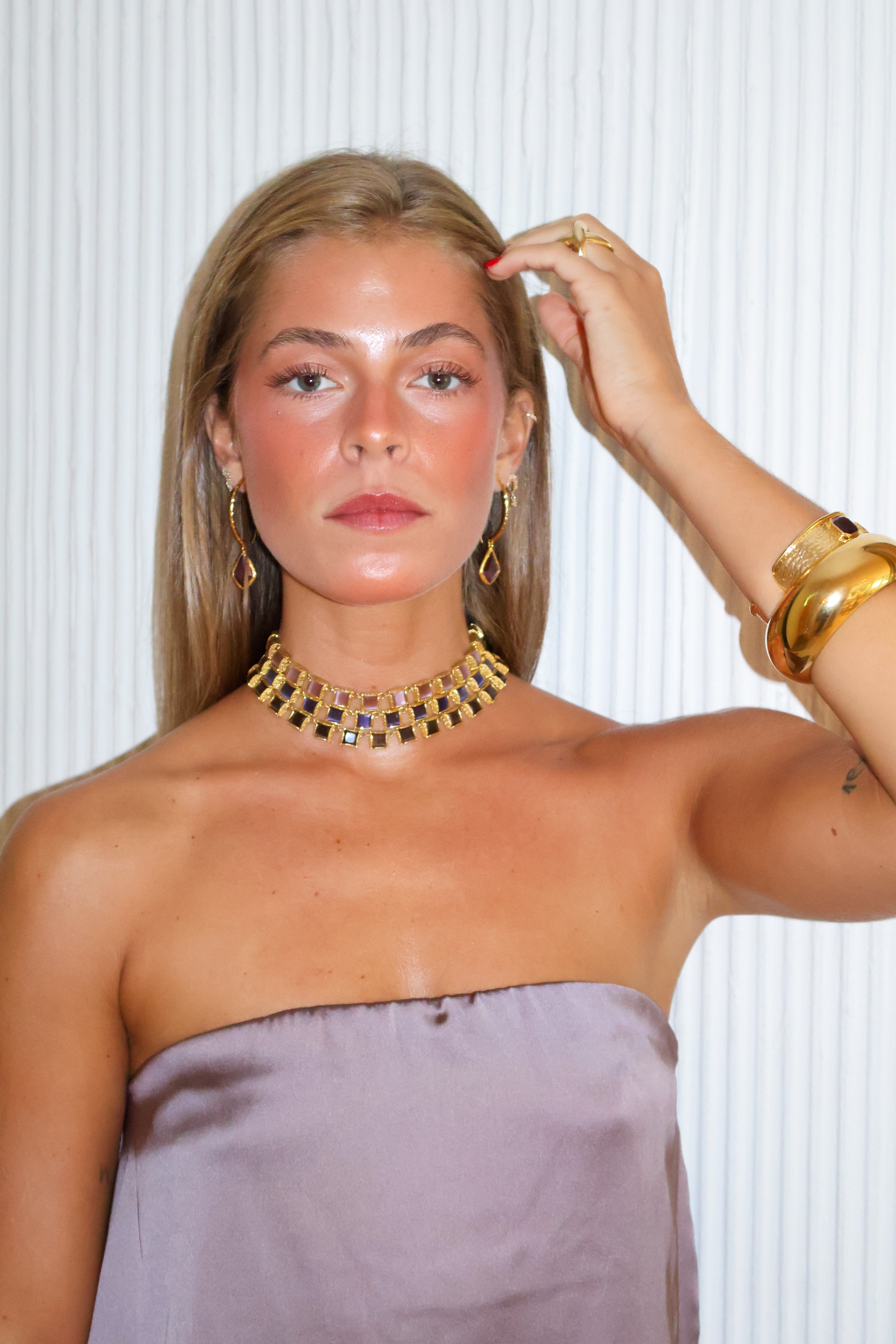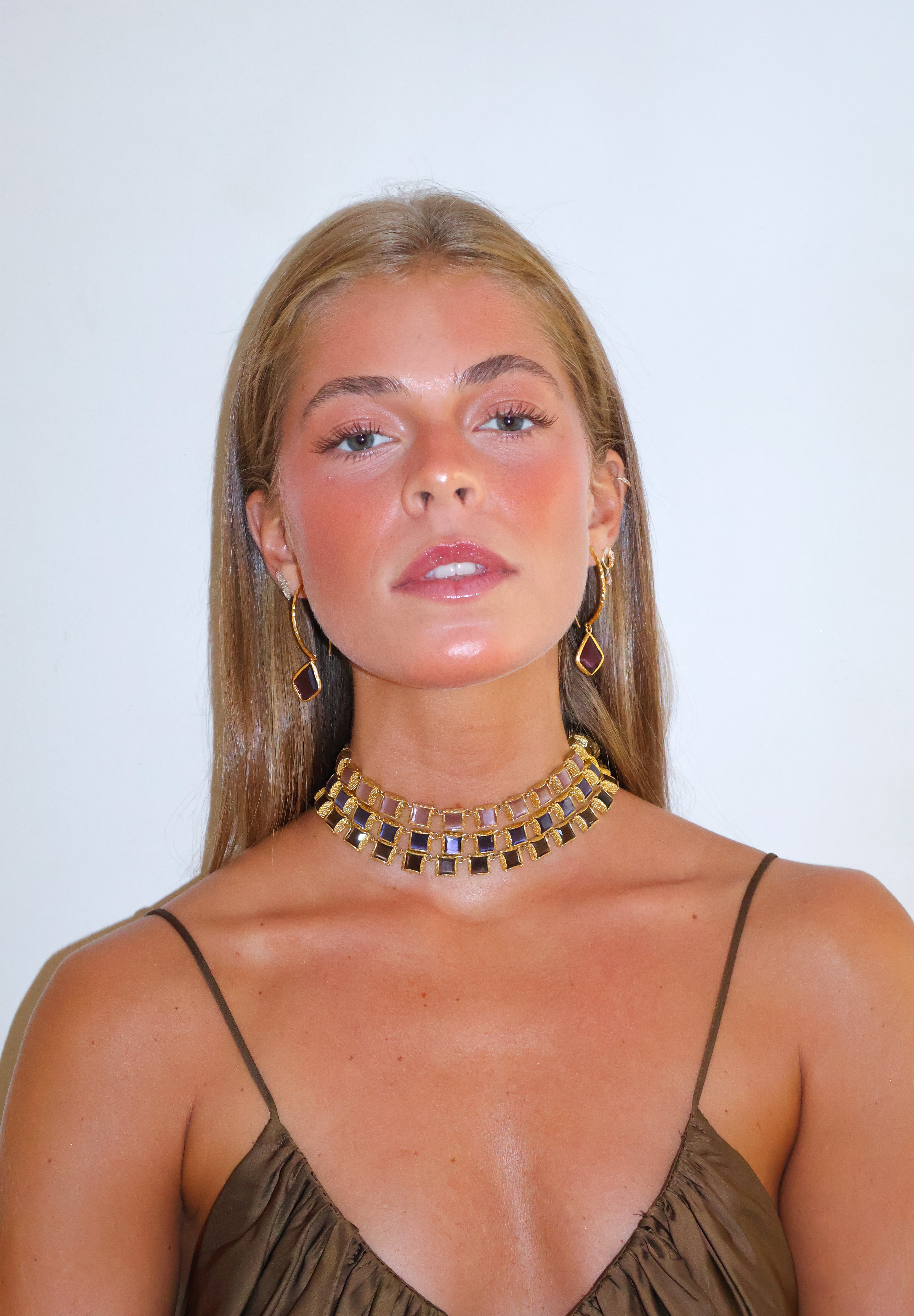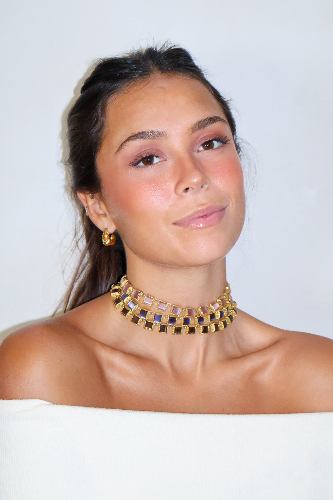 Este chocker tiene lo mejor de los 3 mundos. Está hecho a mano en latón bañado en oro de 18k y piedras naturales de cuarzo marrón, rosa y morado que simbolizan el poder y la elegancia.