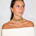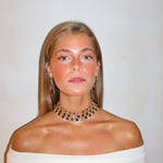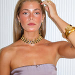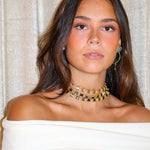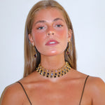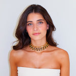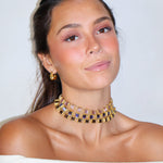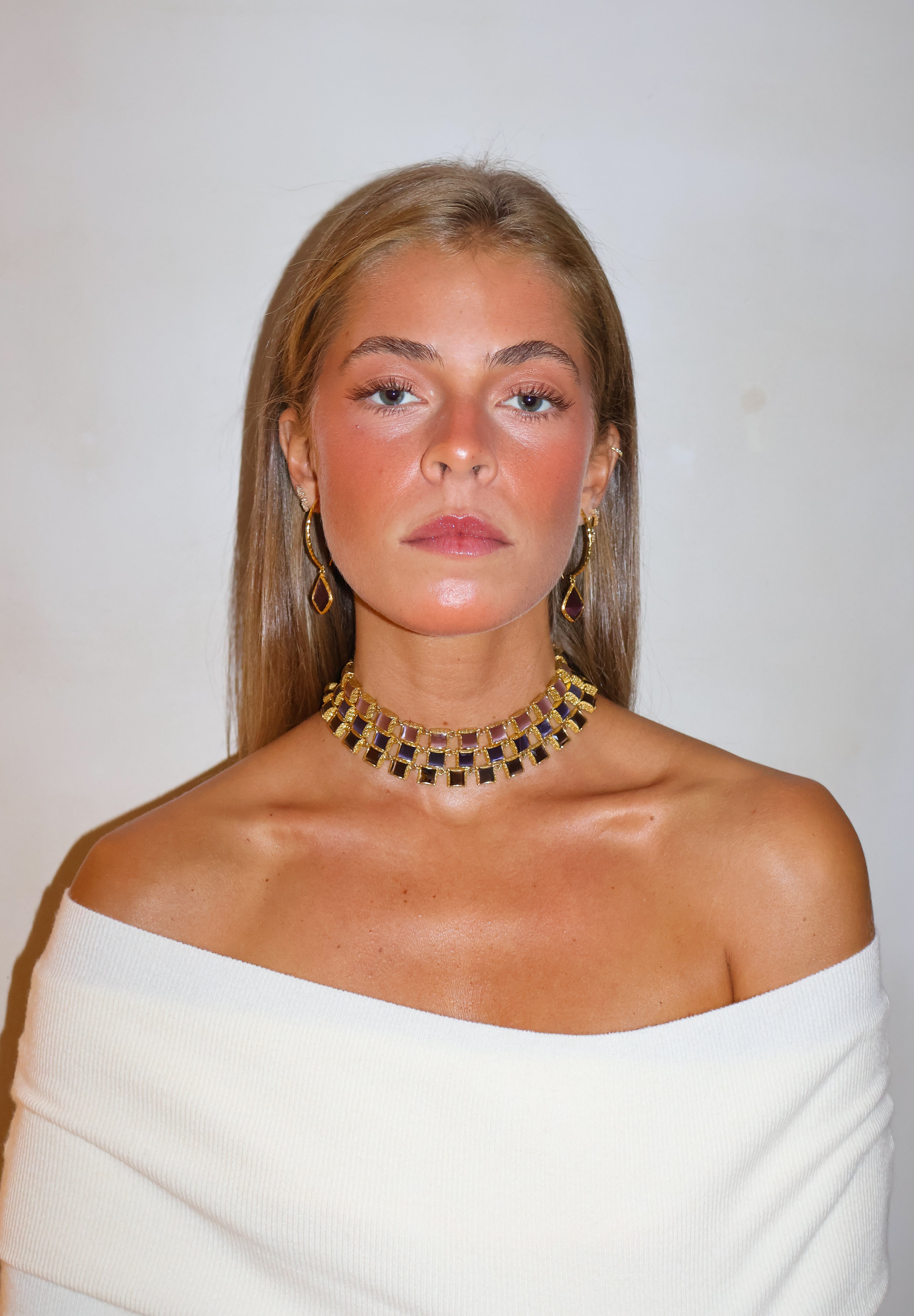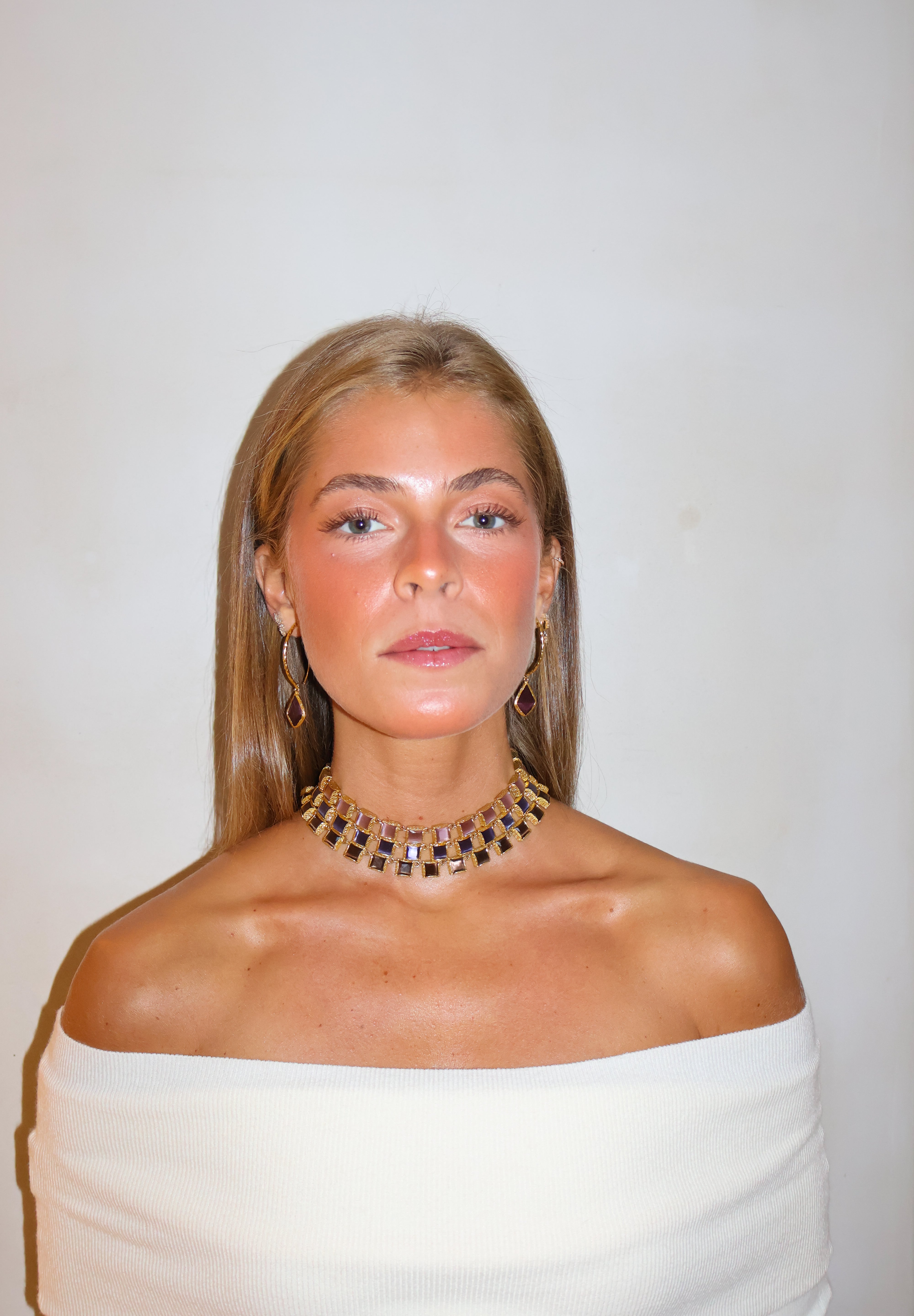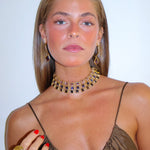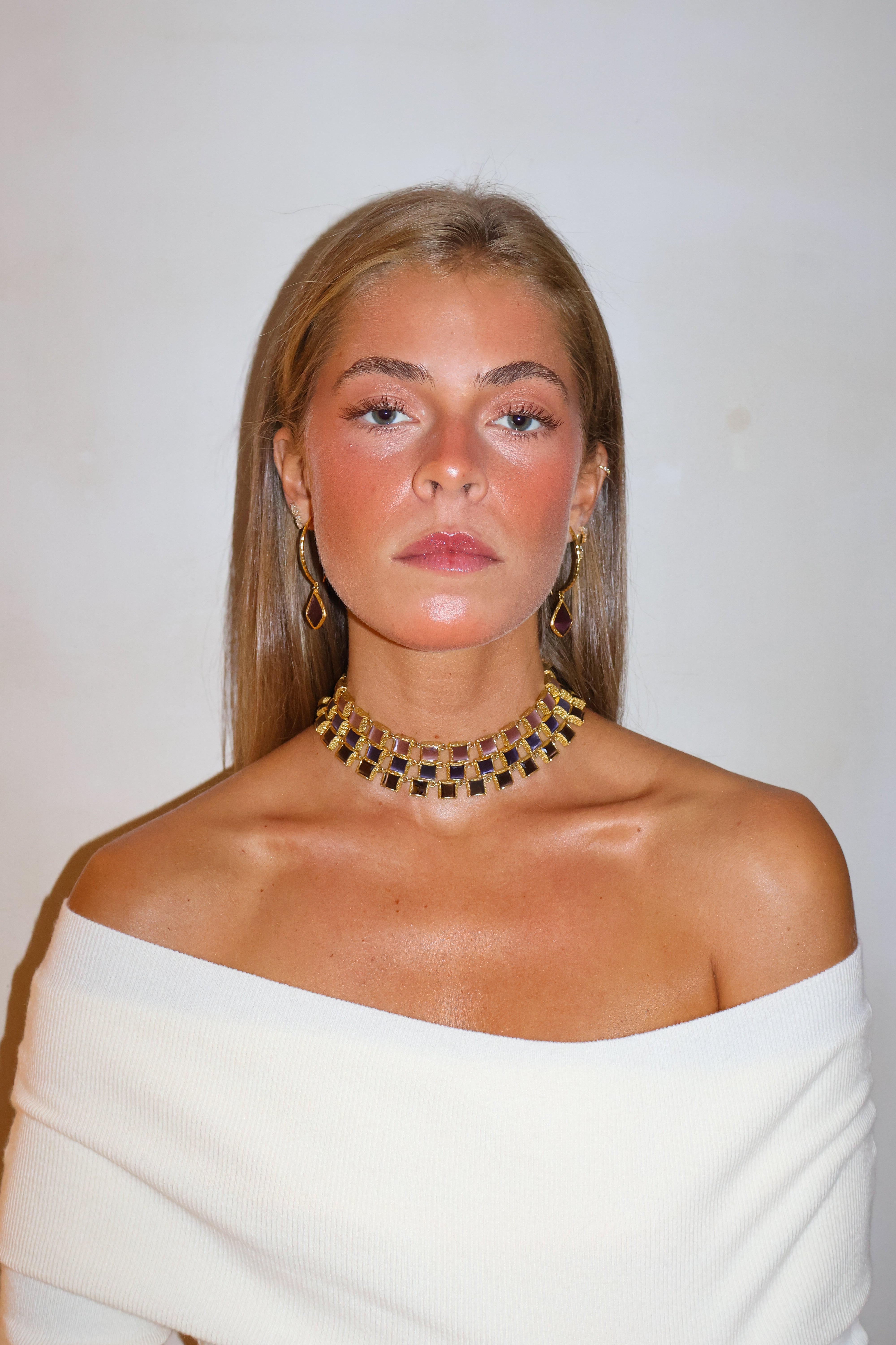 Este chocker tiene lo mejor de los 3 mundos. Está hecho a mano en latón bañado en oro de 18k y piedras naturales de cuarzo marrón, rosa y morado que simbolizan el poder y la elegancia.