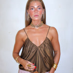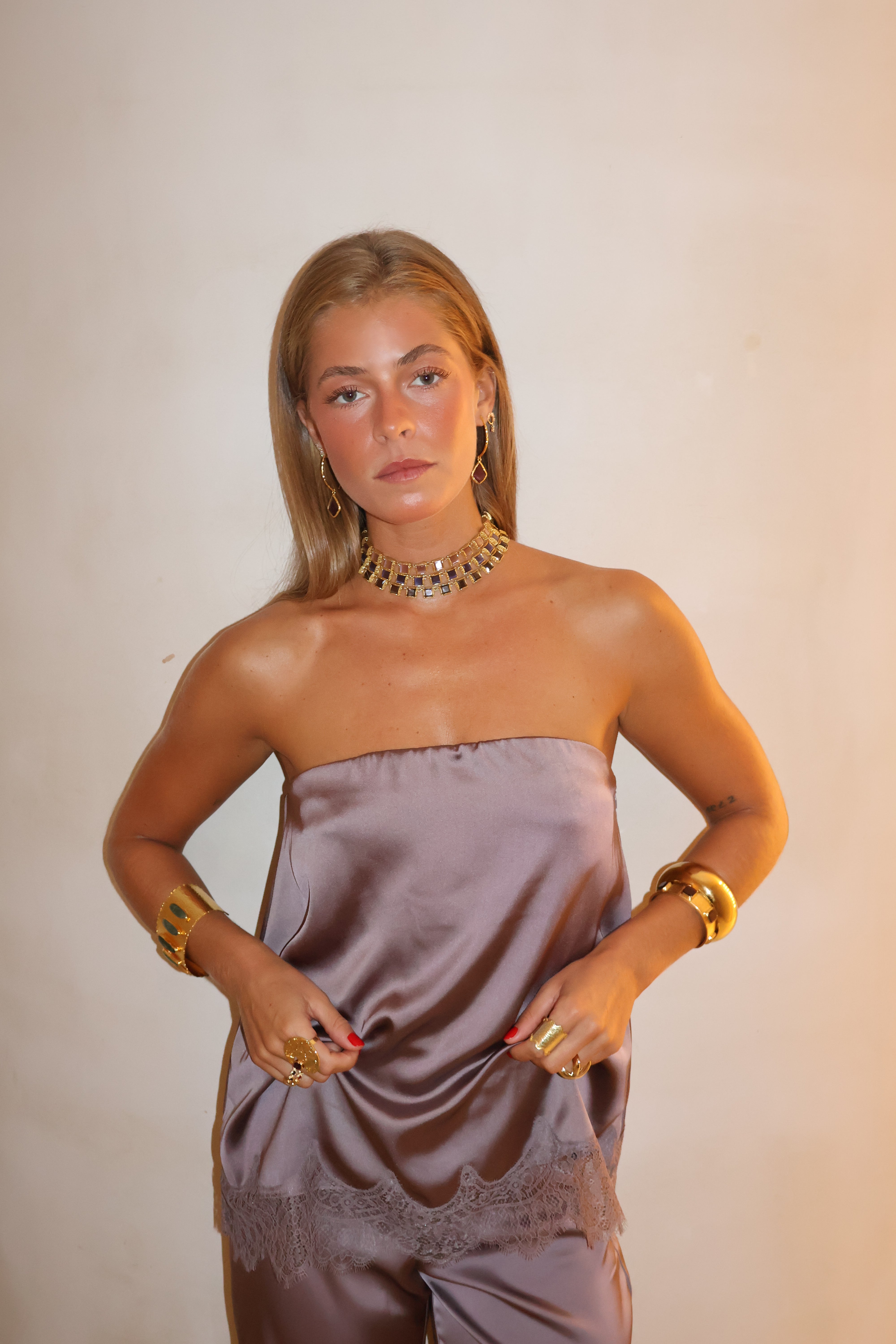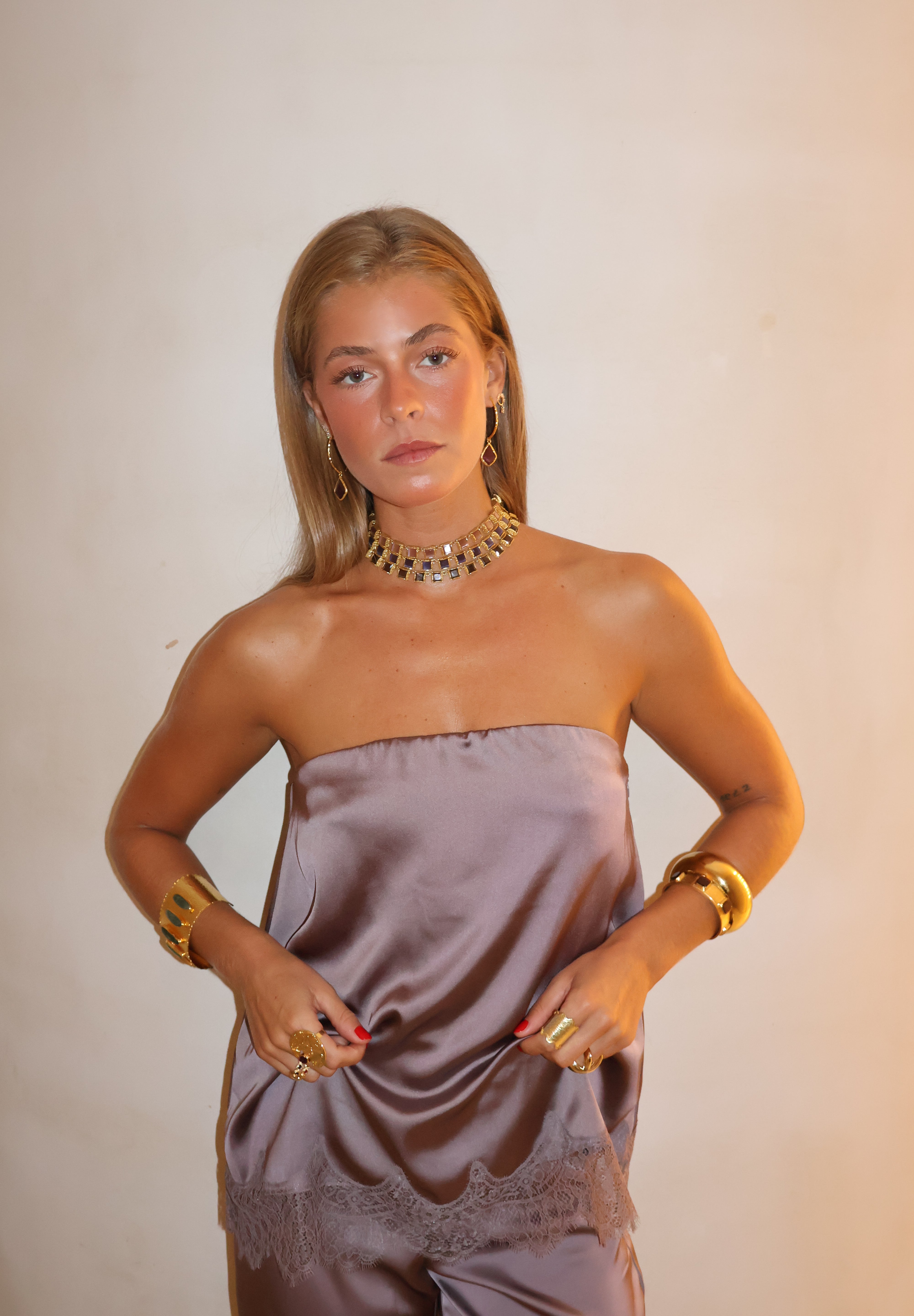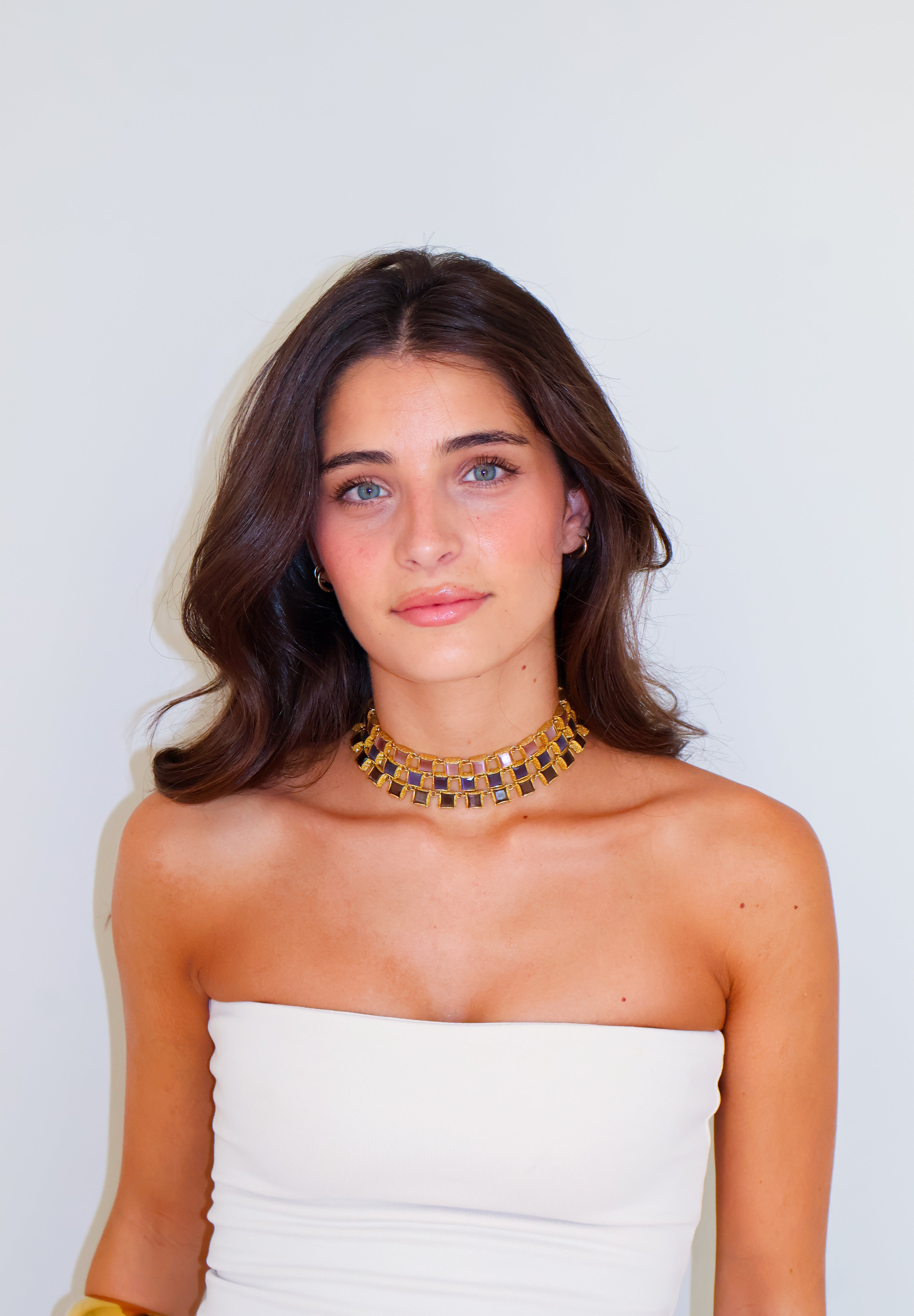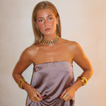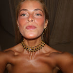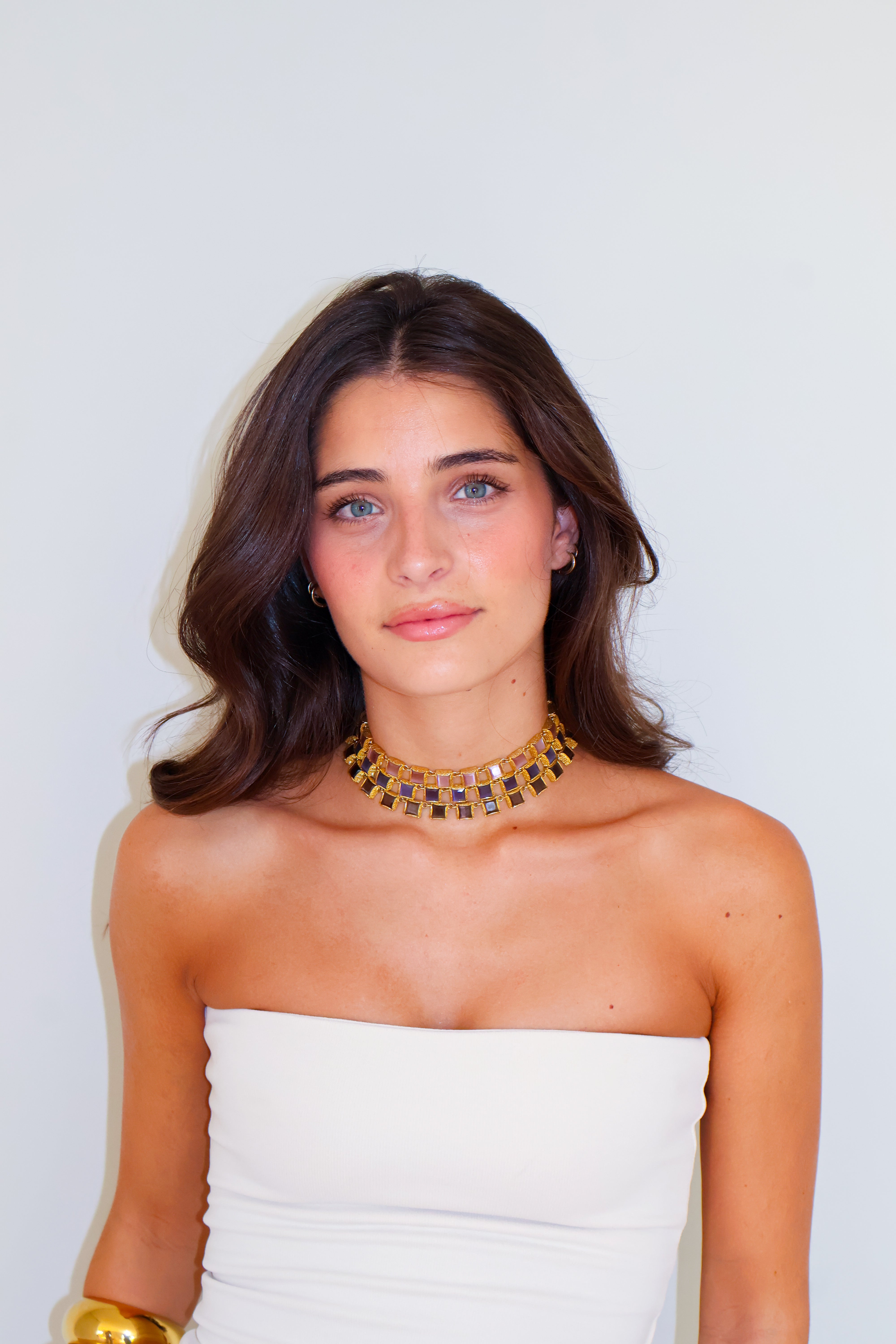 Este chocker tiene lo mejor de los 3 mundos. Está hecho a mano en latón bañado en oro de 18k y piedras naturales de cuarzo marrón, rosa y morado que simbolizan el poder y la elegancia.