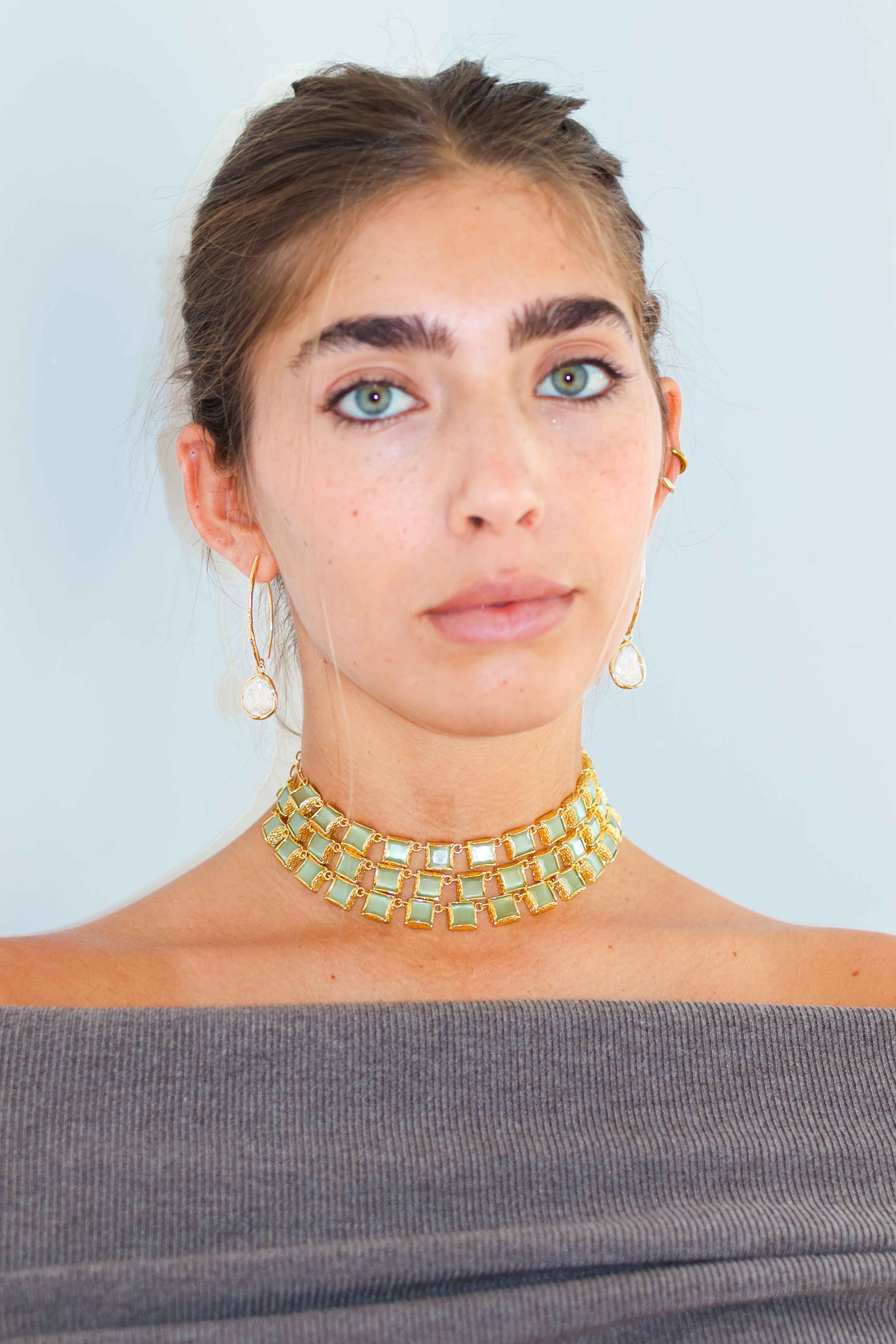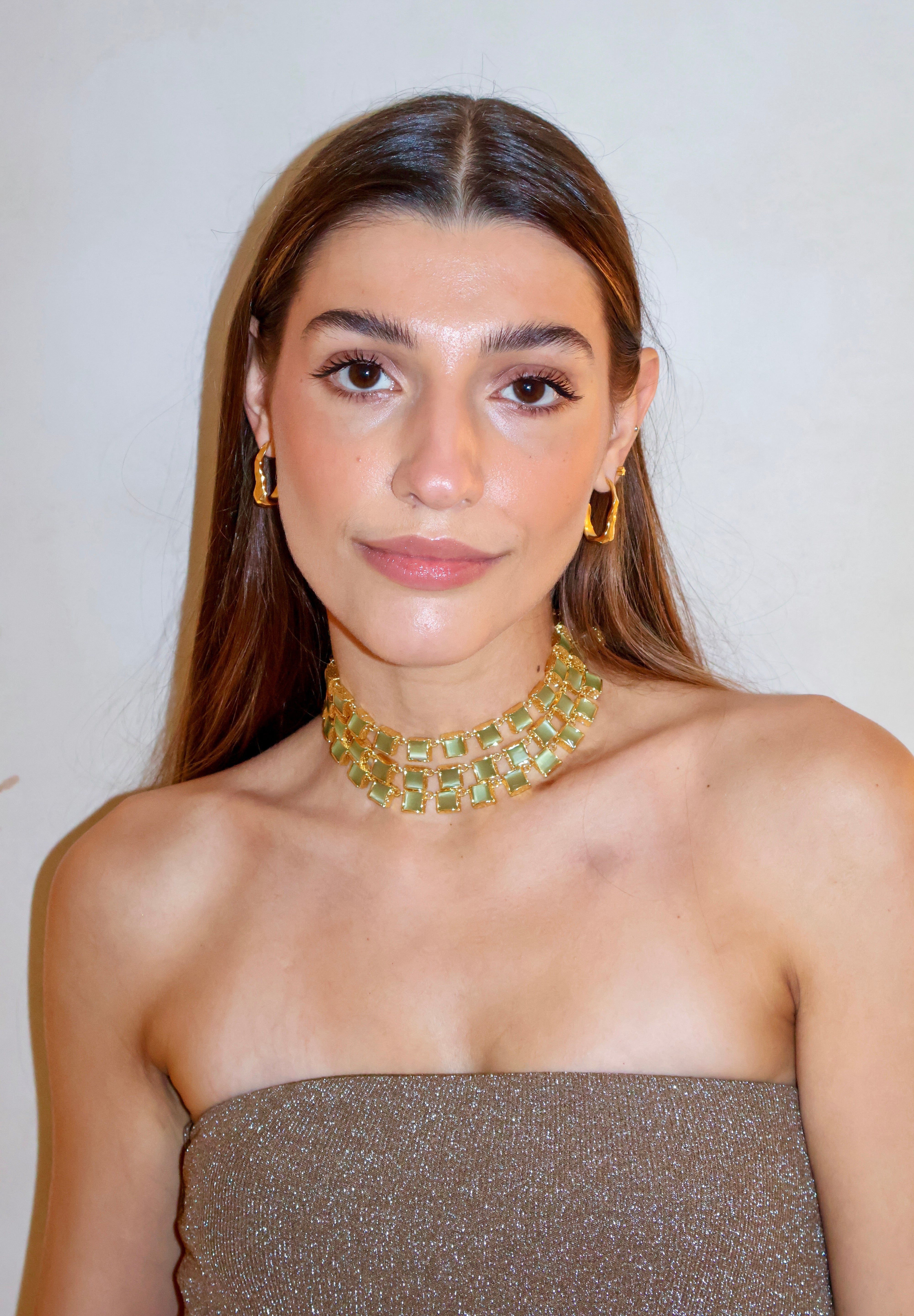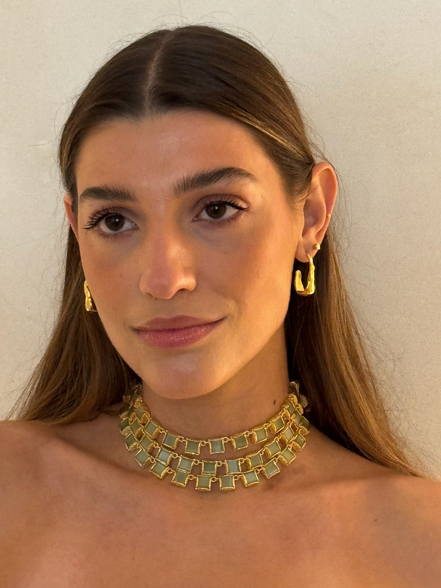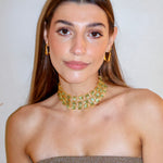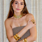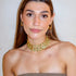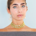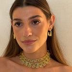 Este chocker tiene lo mejor de los 3 mundos. Está hecho a mano en latón bañado en oro de 18k y piedras naturales de cuarzo verde que simbolizan el poder y la elegancia.