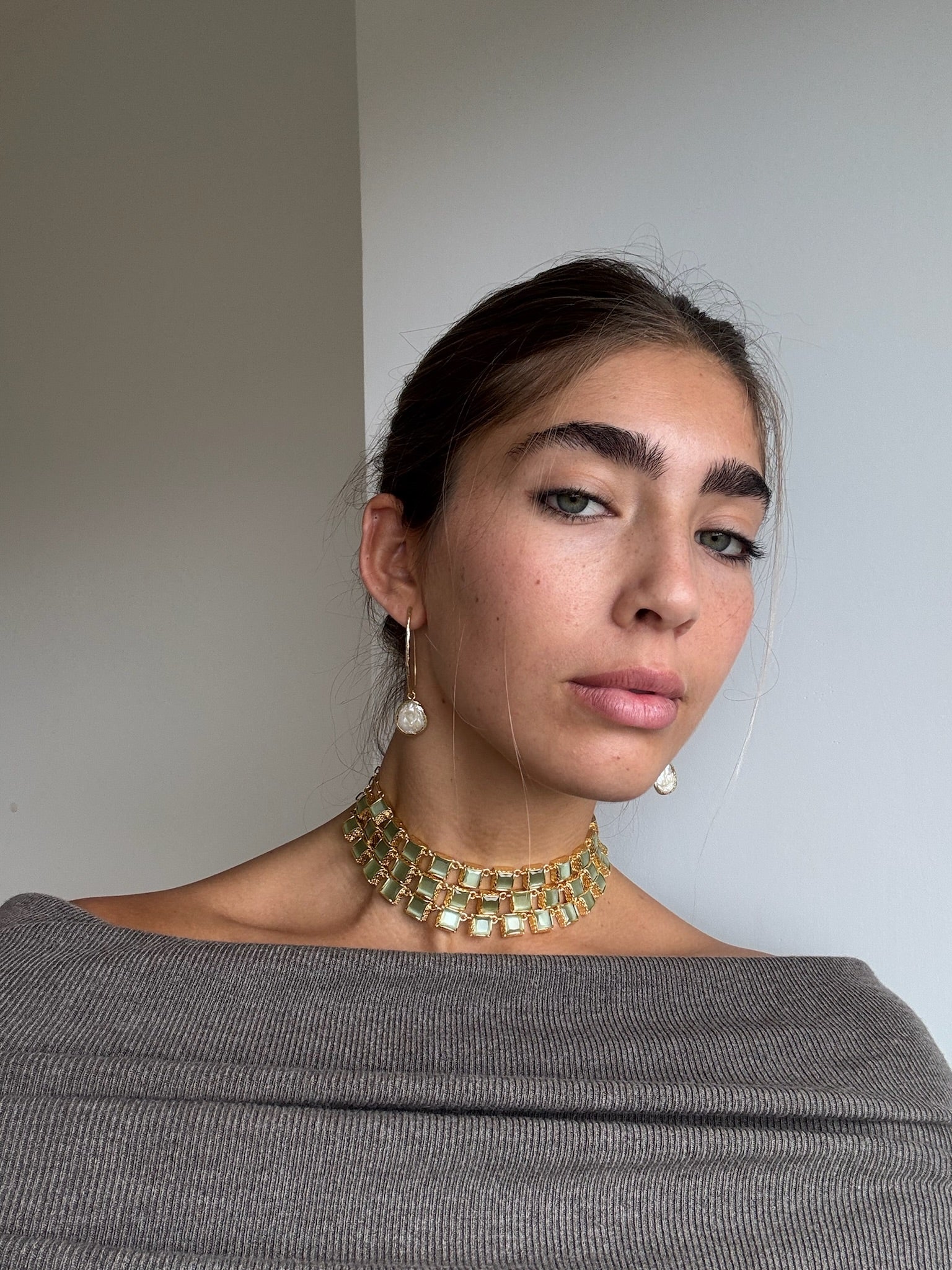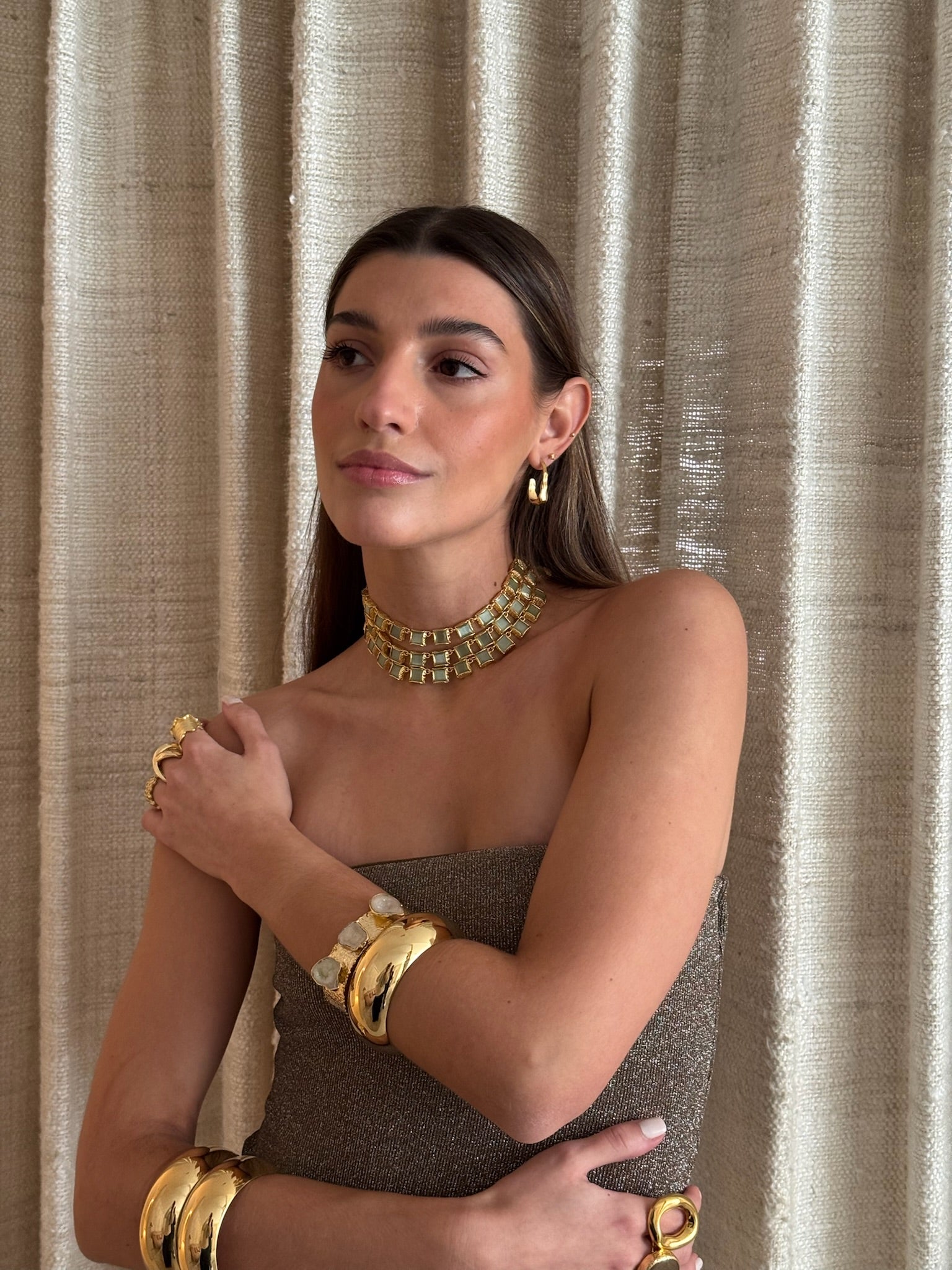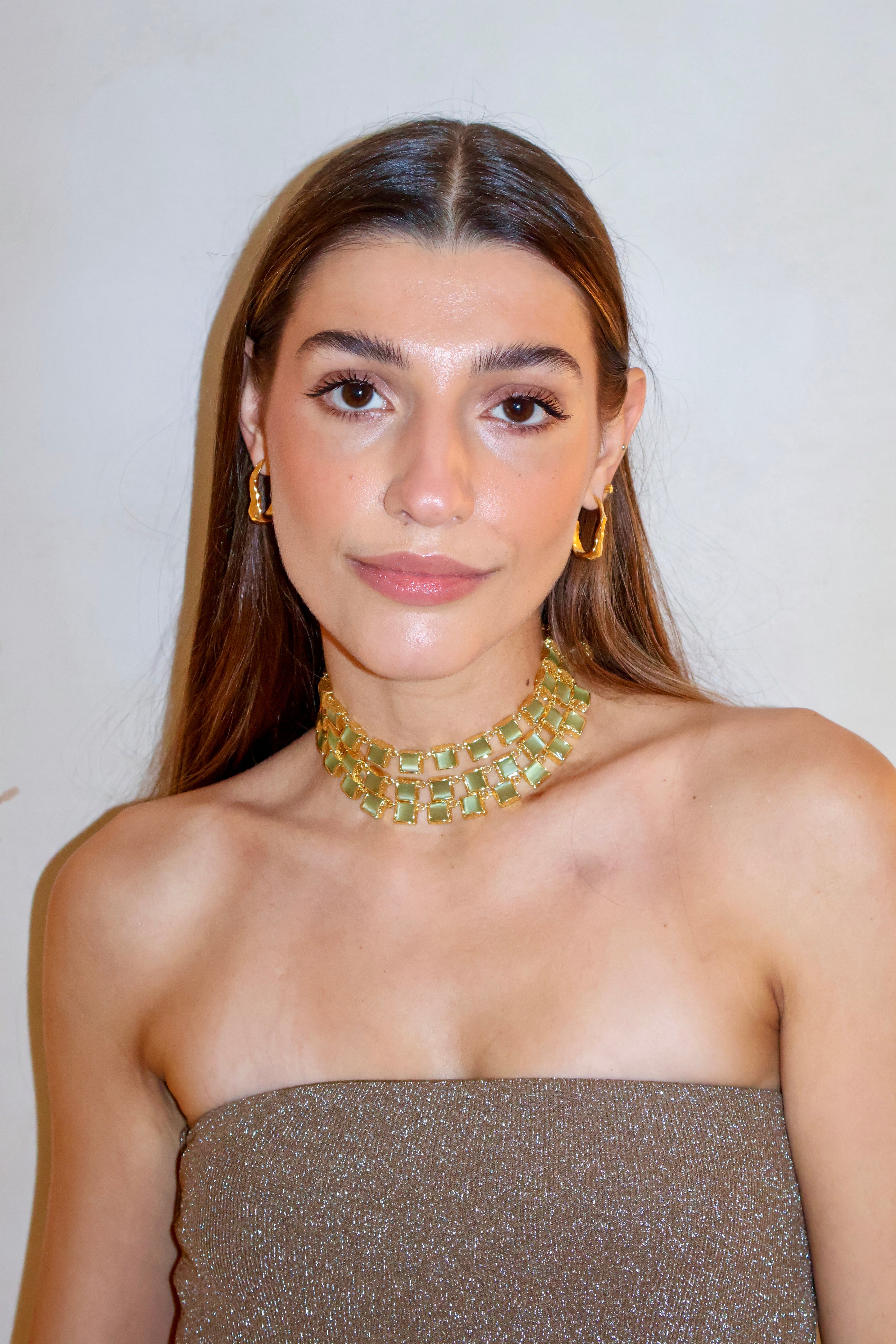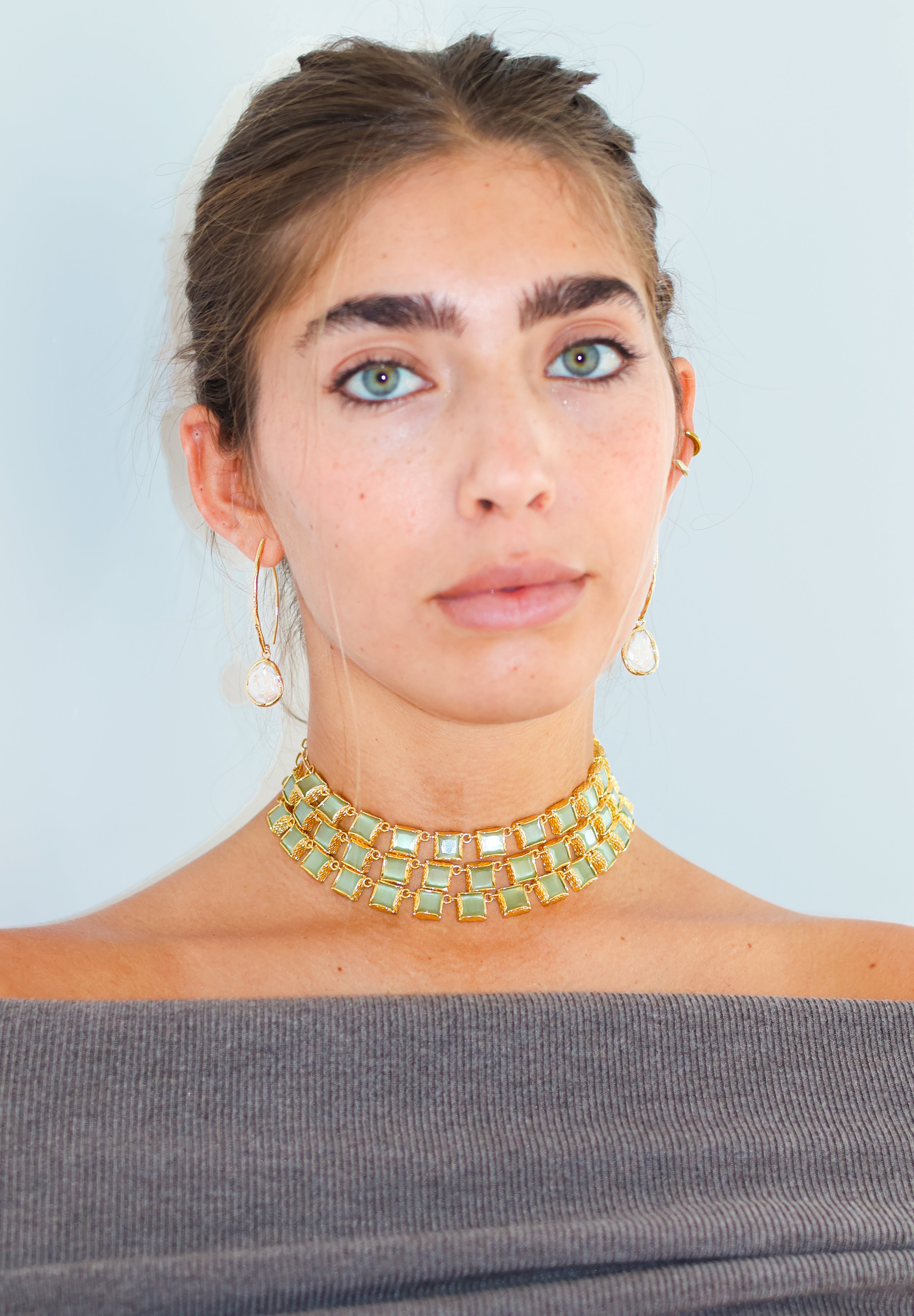 Este chocker tiene lo mejor de los 3 mundos. Está hecho a mano en latón bañado en oro de 18k y piedras naturales de cuarzo verde que simbolizan el poder y la elegancia.