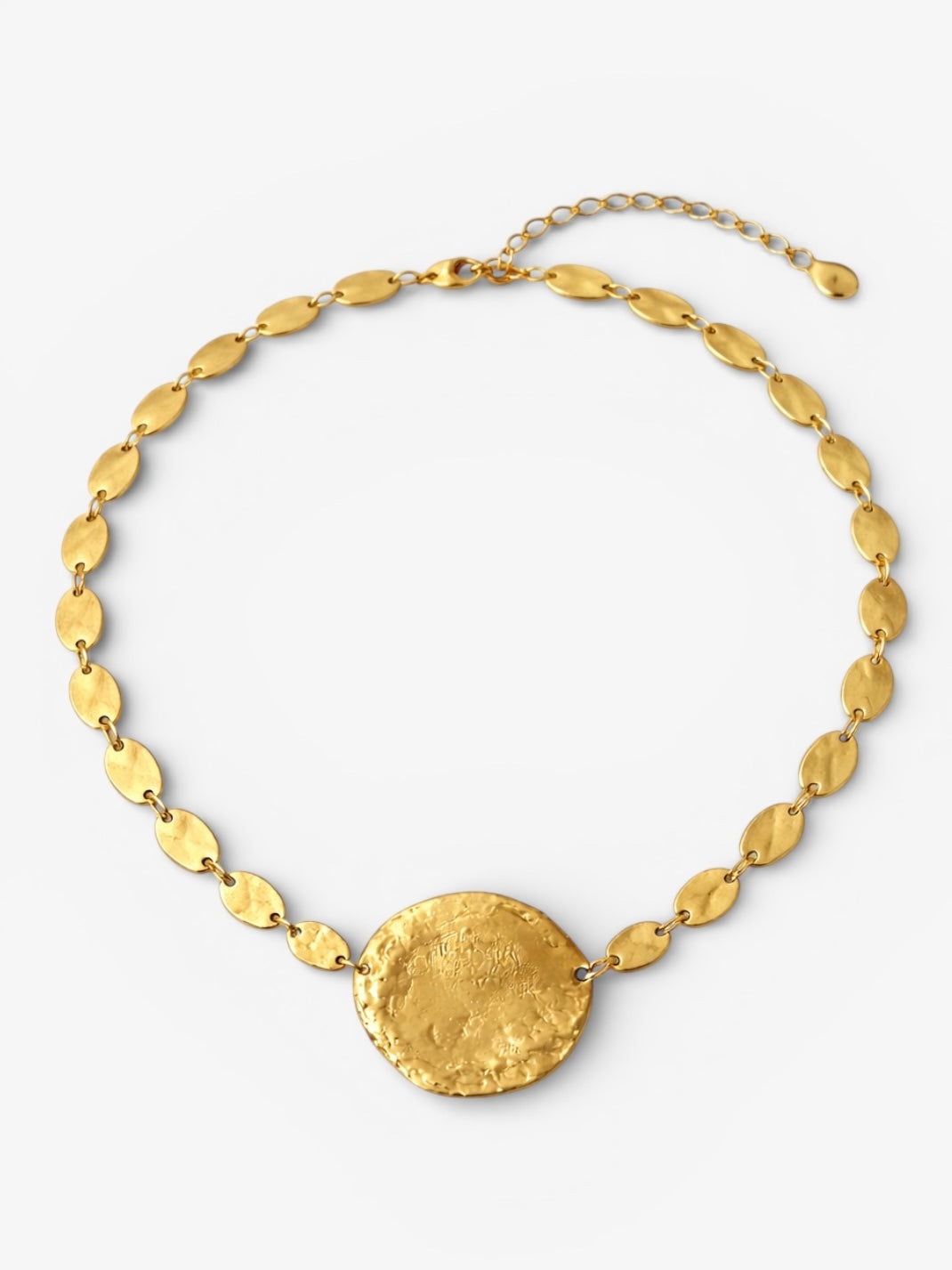 El Choker Cráter es una pieza statement inspirada en las formas orgánicas y las texturas imperfectas de la superficie lunar. Su pieza central, con acabado irregular y efecto crudo, aporta carácter y fuerza, convirtiéndolo en el protagonista absoluto del look.