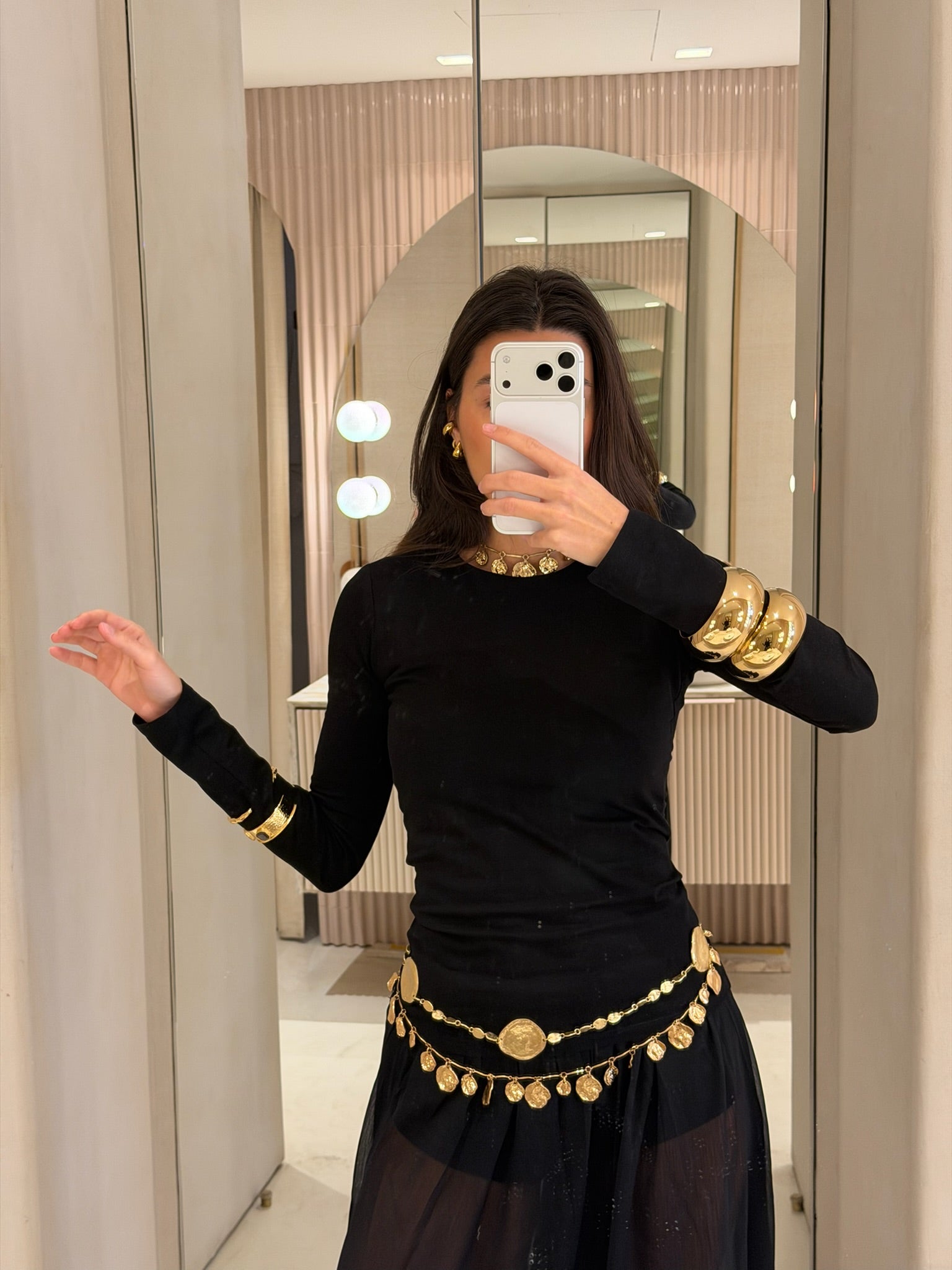 El Cinturón Cráter es una pieza statement inspirada en las formas orgánicas y las texturas imperfectas de la superficie lunar, con acabado irregular y efecto crudo, aporta carácter y fuerza, convirtiéndolo en el protagonista absoluto del look.