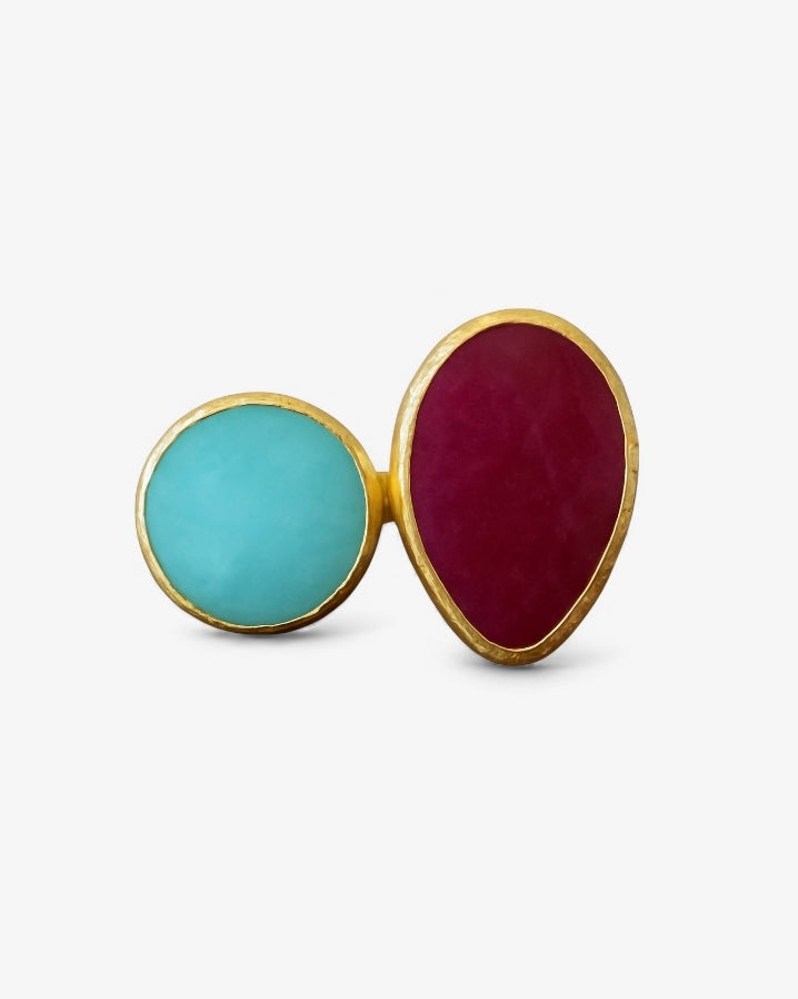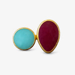 Anillo ajustable de doble piedra, hecho a mano en latón bañado en oro de 18k, con piedras naturales en tonos turquesa claro y fucsia vibrante.
